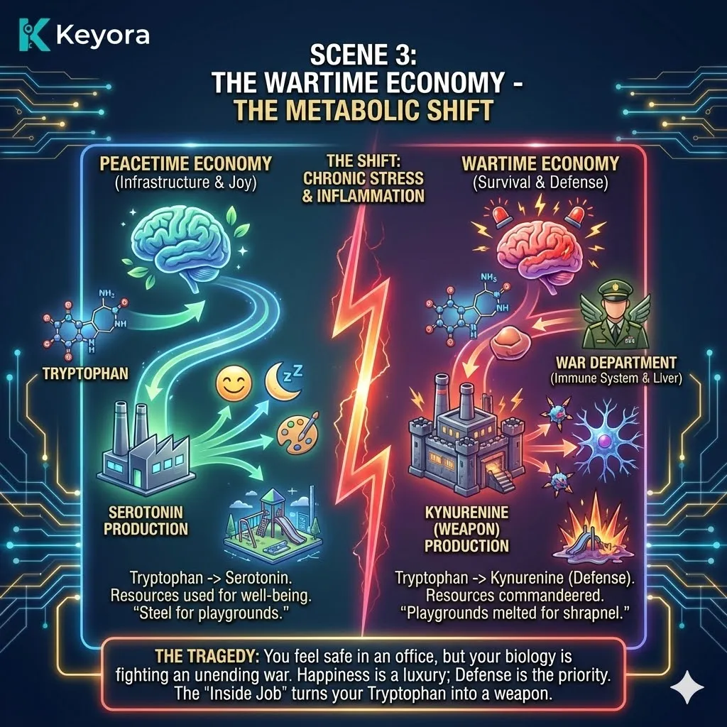 - The Crime Scene: We exposed the Wartime Economy. We saw how chronic stress (Cortisol) and sterile inflammation (Cytokines) convince your body that it is fighting a plague, forcing it to declare Martial Law on your mood.