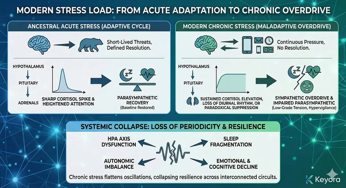 Chronic stress flattens these oscillations, collapsing resilience across multiple interconnected circuits. This collapse is the starting point for understanding why the stress–sleep–emotion–cognition network fails and why HPA axis dysfunction becomes inevitable.