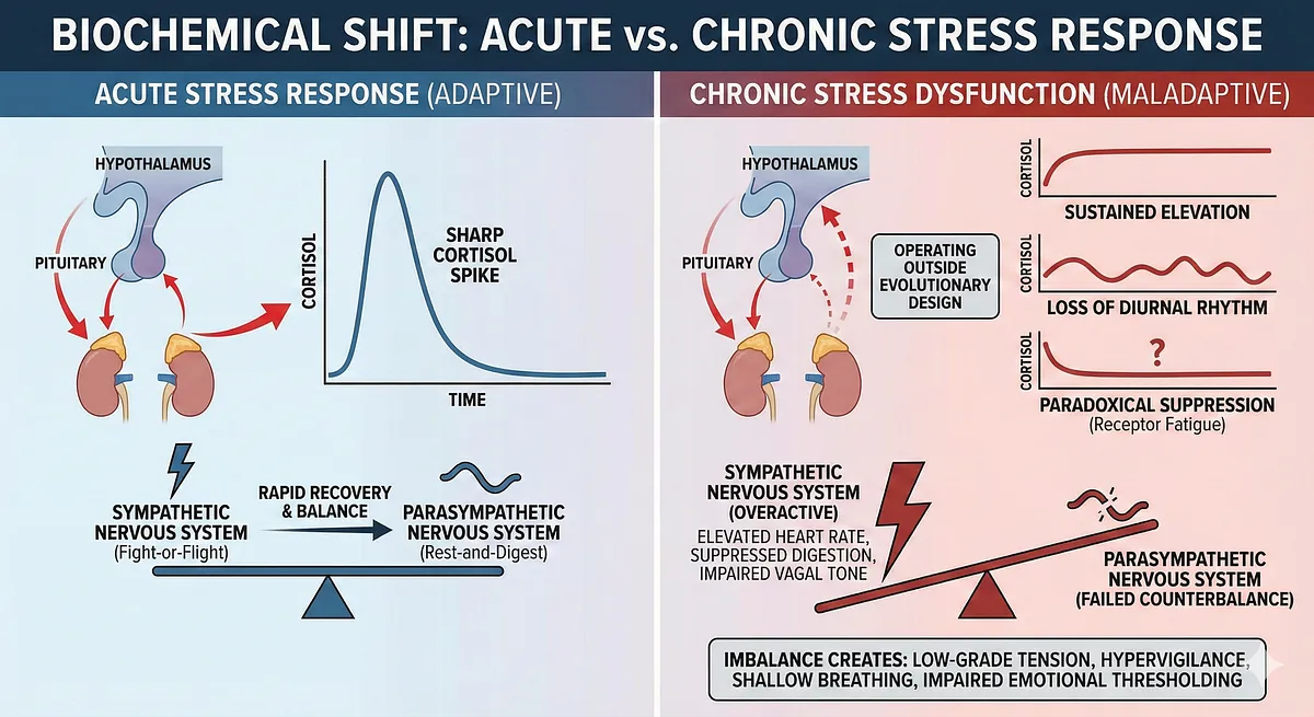 This imbalance creates a biological environment dominated by low-grade tension, hypervigilance, shallow breathing, and impaired emotional thresholding.