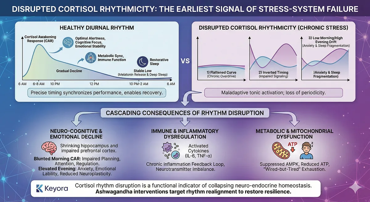 By improving the cortisol awakening response (CAR), restoring diurnal decline, and reducing inappropriate evening elevations, it re-establishes the timing signals that coordinate metabolism, cognition, and immunity.