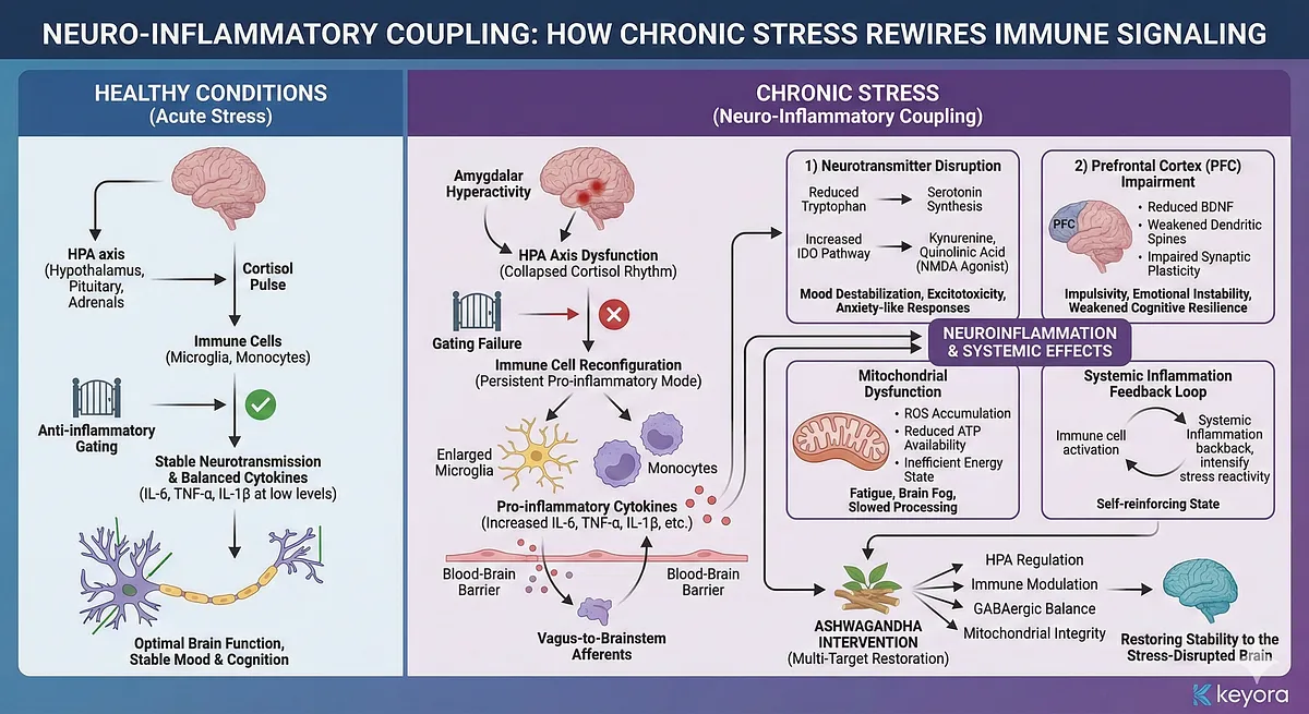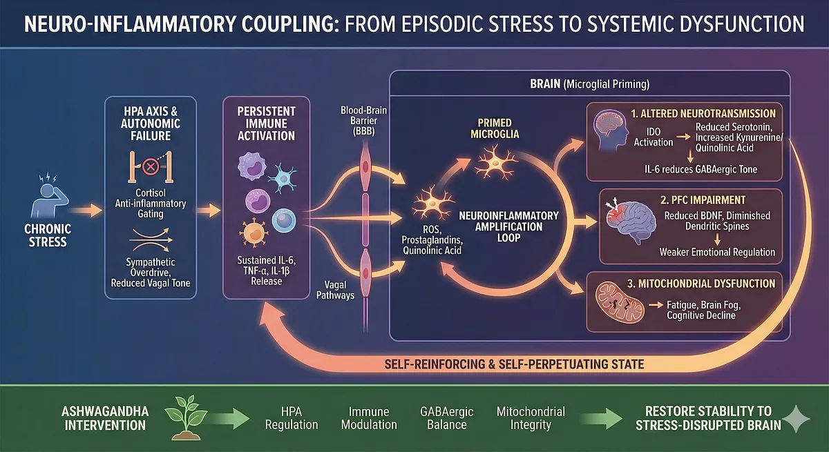 Understanding this mechanism is essential for appreciating why interventions such as Ashwagandha – acting simultaneously on HPA regulation, immune modulation, GABAergic balance, and mitochondrial integrity – are uniquely suited for restoring stability to the stress-disrupted brain.