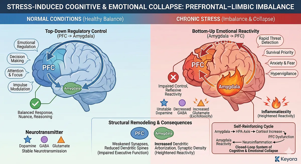 Over time, this dysregulation contributes to hippocampal shrinkage, impaired amygdala gating, and a reduced threshold for emotional reactivity.