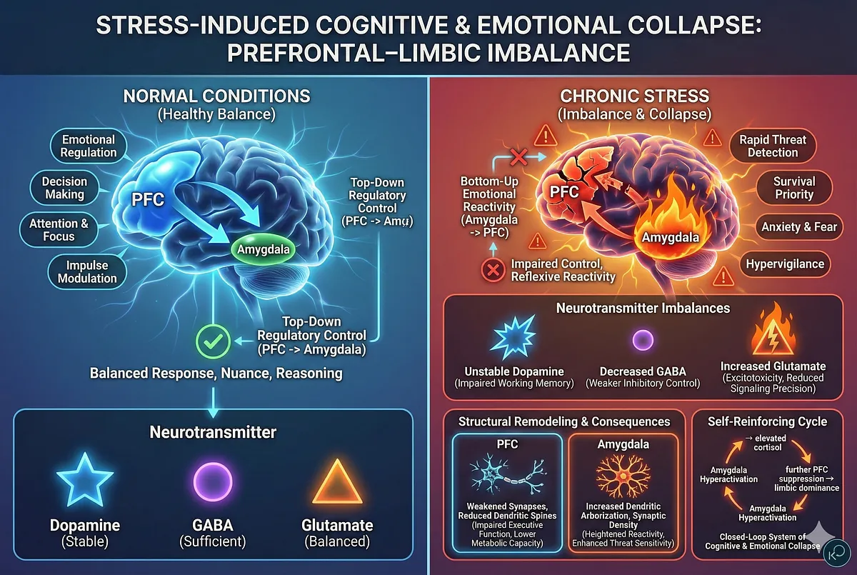 Simultaneously, the prefrontal–limbic imbalance outlined in Section IV becomes the central neural manifestation of chronic stress. The prefrontal cortex (PFC) weakens due to cortisol toxicity, glutamatergic overload, and inflammatory signaling. Its ability to regulate threat responses, manage attention, and modulate emotion diminishes. As a result, the amygdala becomes hyperactive, driving excessive anxiety, hypervigilance, emotional reactivity, and intrusive fear learning. This limbic dominance amplifies HPA activation, increasing cortisol output, which in turn further damages the PFC—closing a loop of escalating dysregulation.