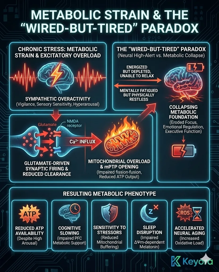 The “wired-but-tired” state is therefore a metabolic paradox produced by neurobiological imbalance.