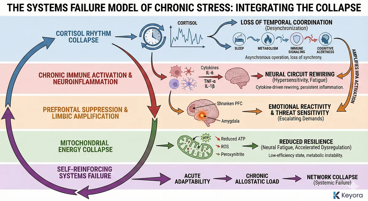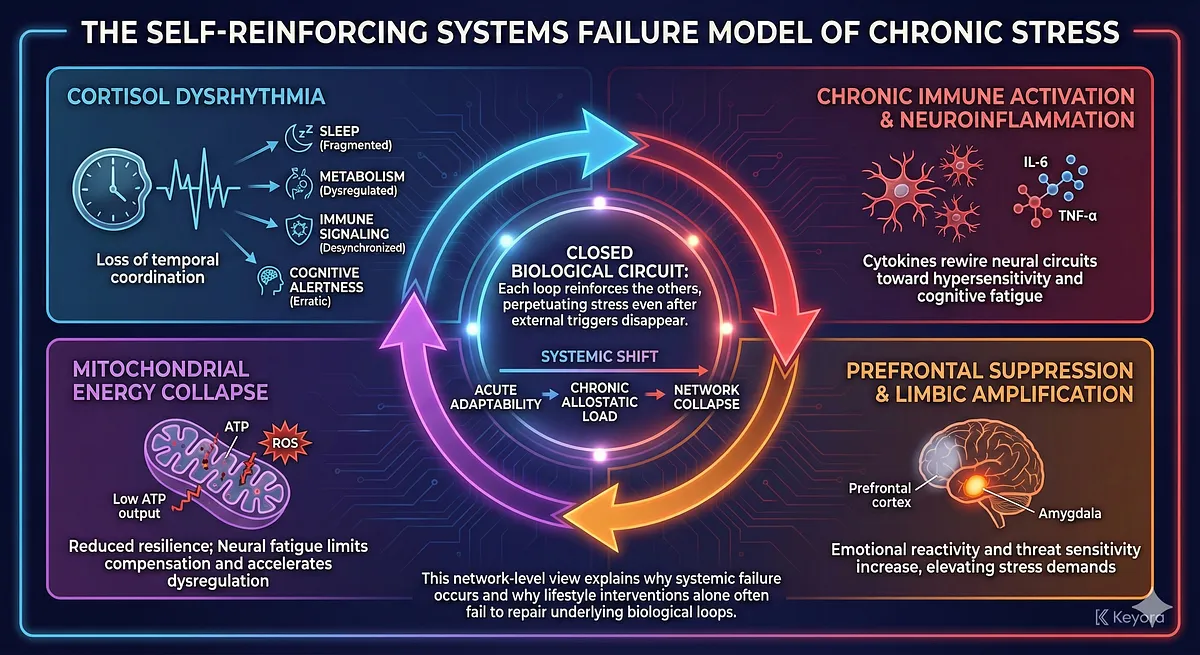 The disruption spans cortisol rhythmicity, immune signaling, neurotransmission, energy metabolism, and neural architecture. Crucially, these components do not fail independently; they fail as an integrated network with self-reinforcing loops.