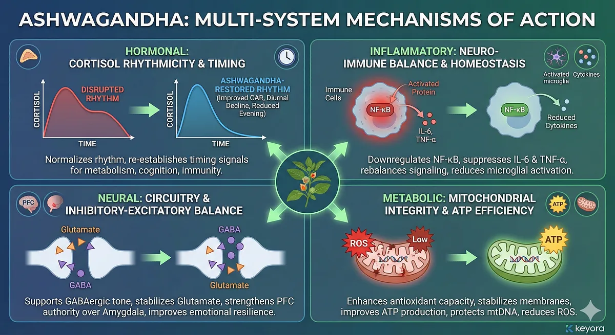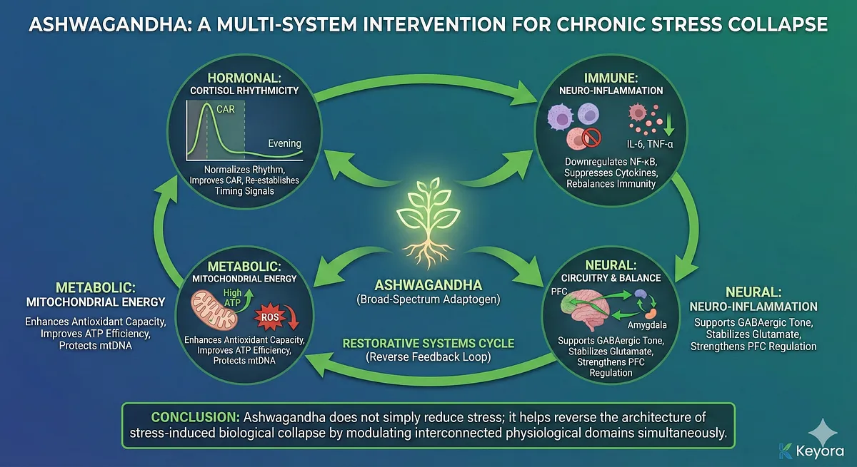 This is why Ashwagandha is a cornerstone of the Keyora Nutritional Neurology framework. It is not positioned as a universal cure, nor as a superficial wellness product, but as a mechanistically grounded intervention for a deeply interconnected physiological problem.