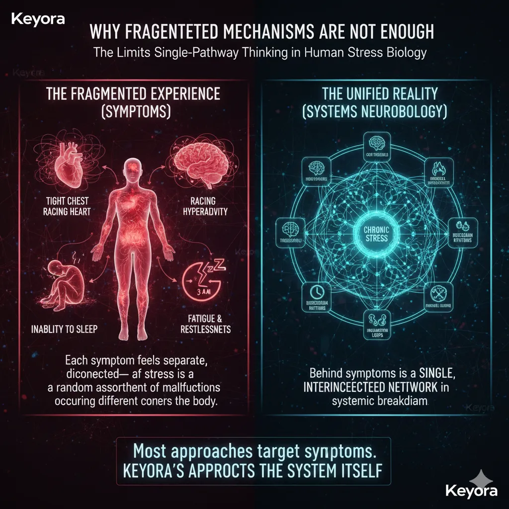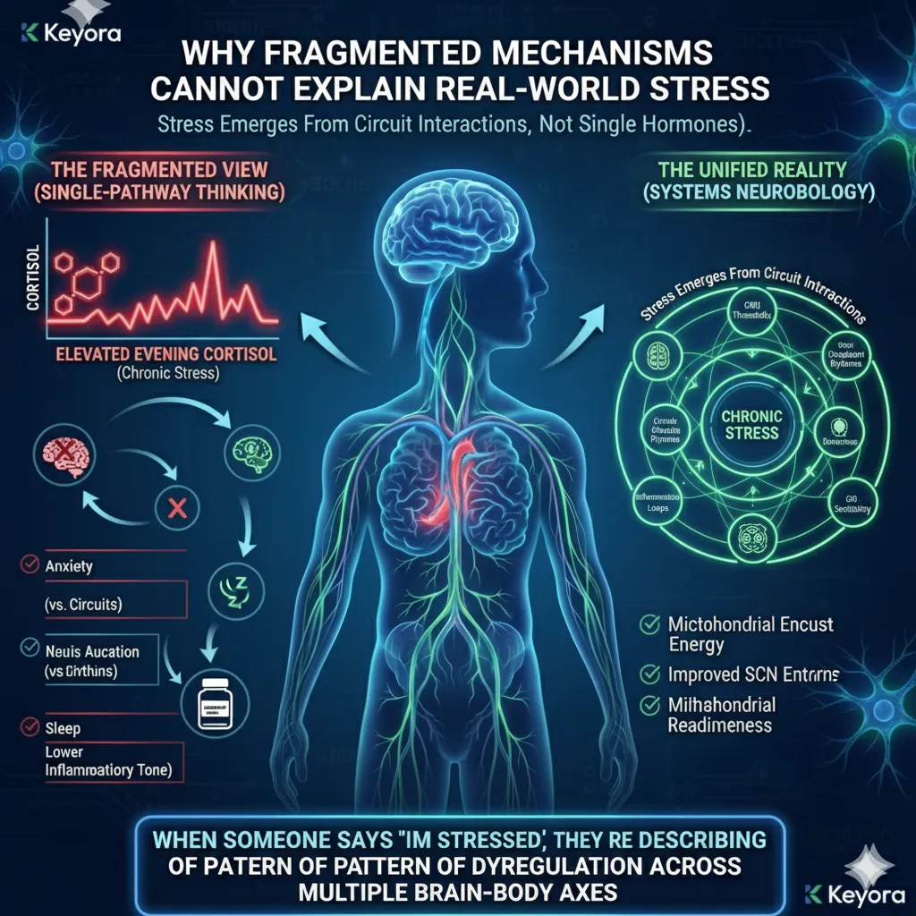 This is why treating stress through single-pathway interventions – “lower cortisol,” “calm the mind,” “sleep better” – often fails.