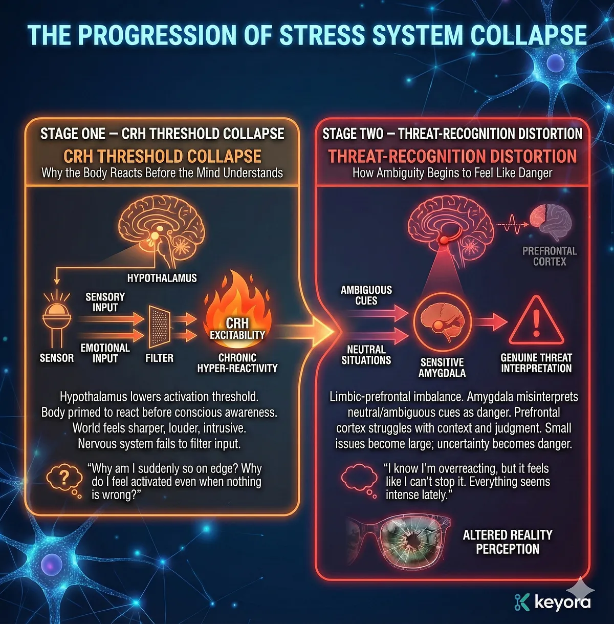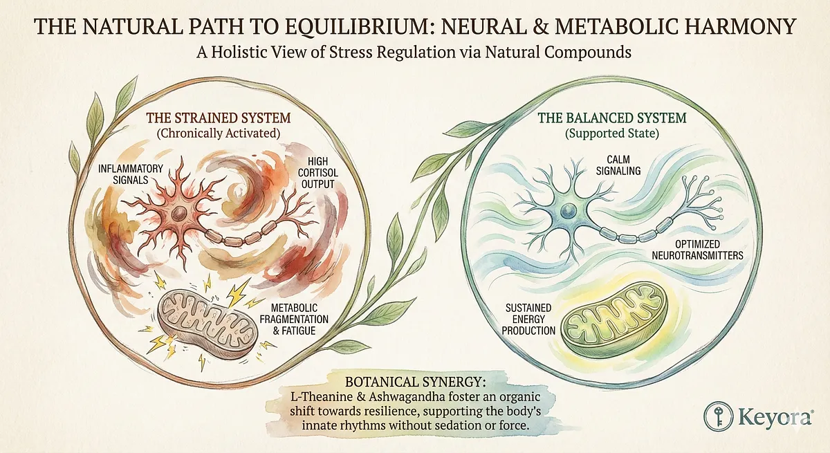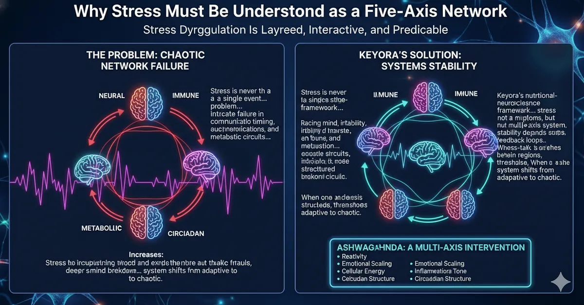 Keyora’s nutritional-neuroscience framework approaches stress not as a cluster of symptoms, but as a multi-axis system whose stability depends on thresholds, feedback loops, and cross-talk between brain regions and peripheral physiology.