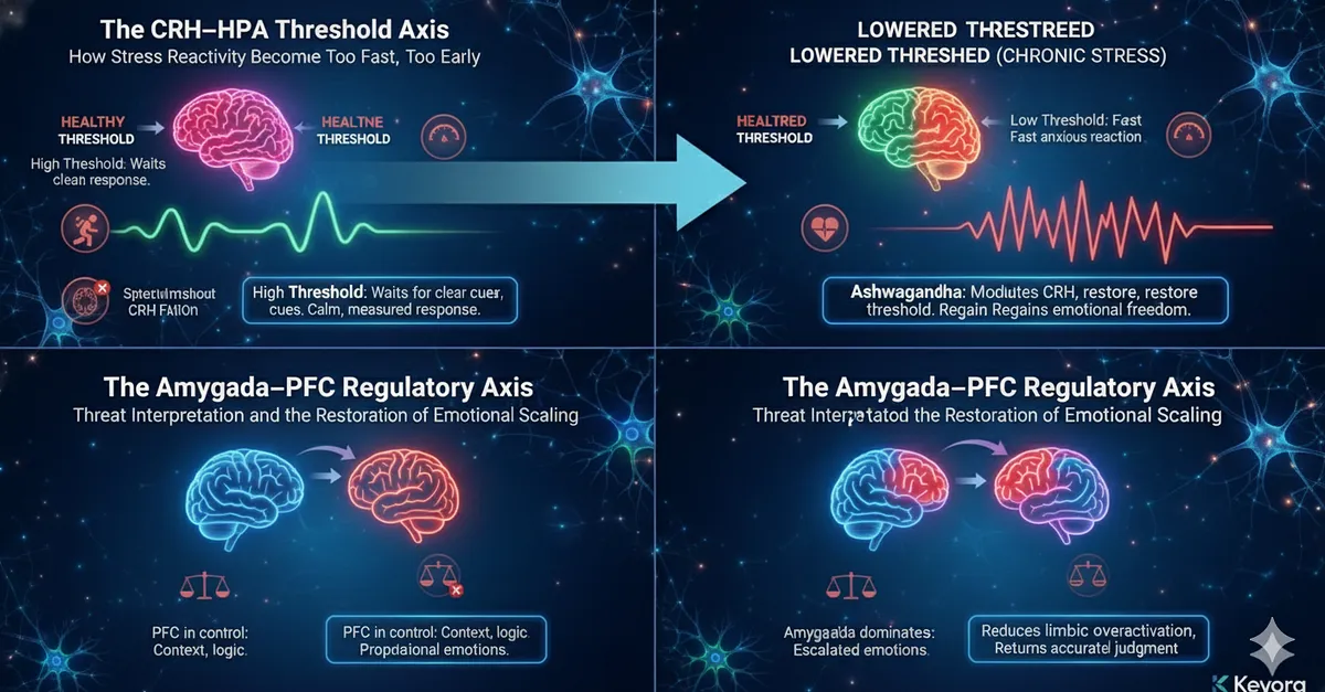 Ashwagandha’s relevance begins here. By modulating CRH neuron excitability and restoring threshold regulation, it returns the gap between signal and reaction.