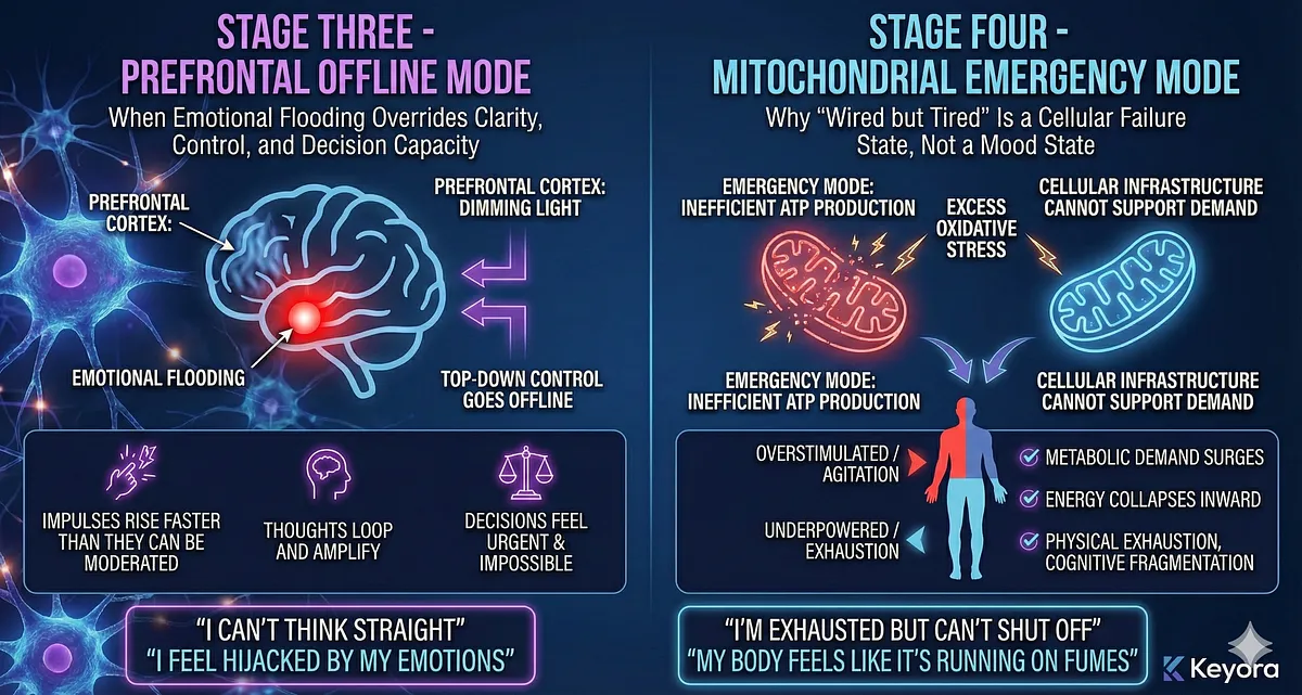 Low mitochondrial output reduces patience, emotional stability, and cognitive bandwidth. Tasks that were once manageable begin to feel overwhelming. Emotional resilience shrinks in proportion to metabolic collapse. This is why burnout feels both mental and physical; it is both.