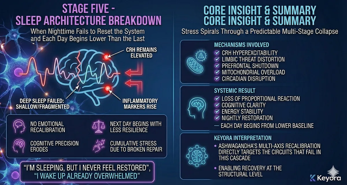 Sleep is not merely a state of rest; it is the biological process through which the stress system recalibrates. But when nighttime CRH remains elevated, the brain cannot enter deep, restorative stages of sleep.