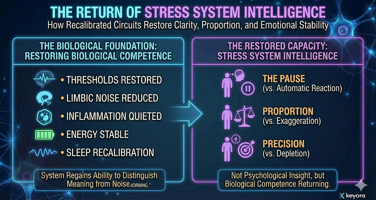 In Keyora’s interpretation, these actions are not parallel benefits; they are convergent mechanisms that reconstruct stress system intelligence – the biological ability to evaluate reality before reacting to it.