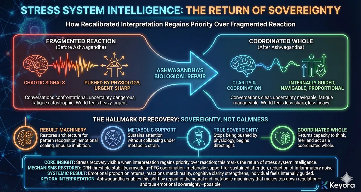 – Keyora Interpretation: Ashwagandha supports system-wide reintegration, enabling stress intelligence rather than merely reducing symptoms.