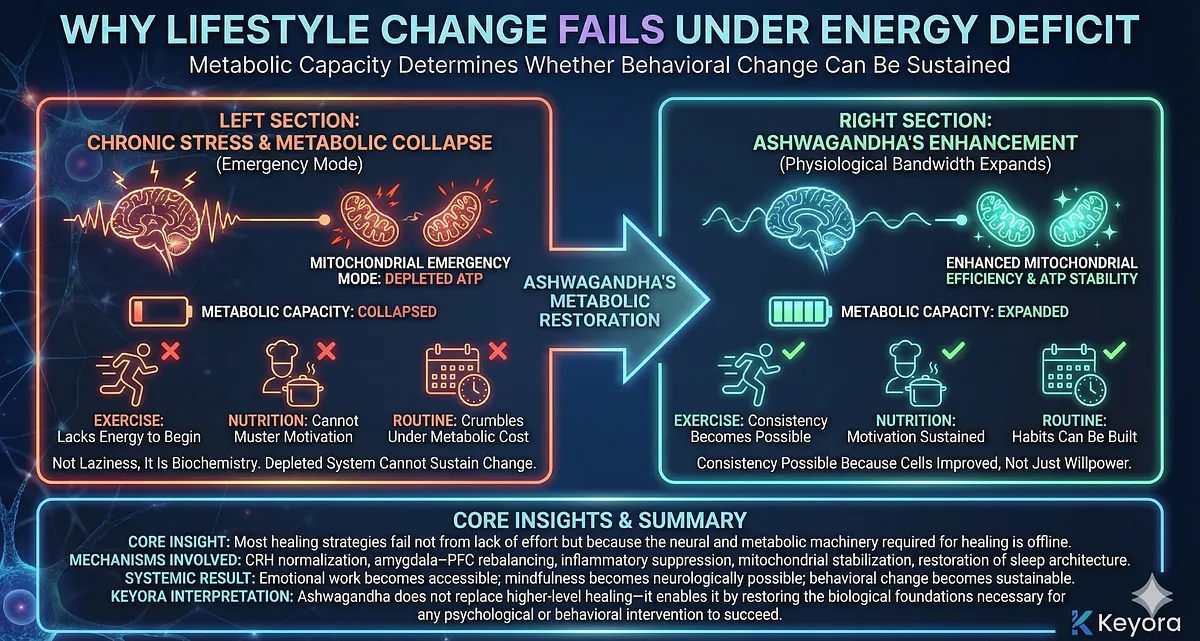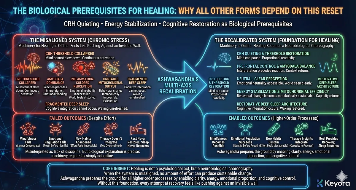– Keyora Interpretation: Ashwagandha is the entry point to all higher healing because it repairs the biological infrastructure required for therapy, mindfulness, behavior change, and resilience-building to succeed.