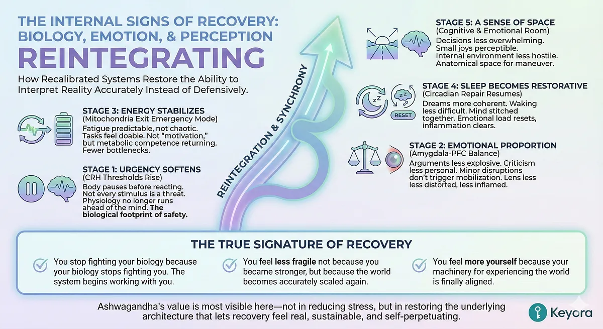 – Keyora Interpretation: Ashwagandha’s impact becomes most visible in the lived experience of coherence returning – biology aligning with perception, and perception aligning with reality.