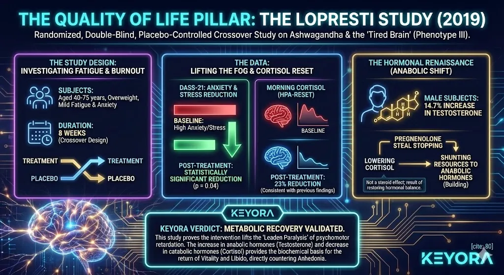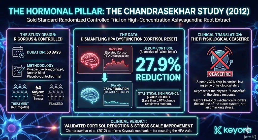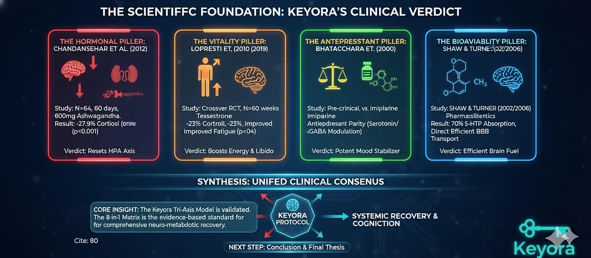 ![The Scientific Foundation of the Keyora Protocol is validated by four studies: Chandrasekhar (2012) showed -27.9% Cortisol and -71.6% Depression (HPA Modulator). Lopresti (2019) showed +14.7% Testosterone and -23% Morning Cortisol (Metabolic Recovery). Bhattacharya (2000) confirmed Antidepressant Parity with Imipramine (Serotonin/GABA Modulation). Shaw/Turner confirmed 5-HTP Bioavailability (~70% absorption) over Tryptophan (Matrix Logistics). [Image showing a graph of serum cortisol reduction over 60 days] The Scientific Foundation of the Keyora Protocol is validated by four studies: Chandrasekhar (2012) showed -27.9% Cortisol and -71.6% Depression (HPA Modulator). Lopresti (2019) showed +14.7% Testosterone and -23% Morning Cortisol (Metabolic Recovery). Bhattacharya (2000) confirmed Antidepressant Parity with Imipramine (Serotonin/GABA Modulation). Shaw/Turner confirmed 5-HTP Bioavailability (~70% absorption) over Tryptophan (Matrix Logistics). [Image showing a graph of serum cortisol reduction over 60 days]](https://www.keyorahealth.com/cdnfiles/2026/03/25072550/af58b9eb-169c-4155-96af-9c8393a0c031_1536x672.webp)