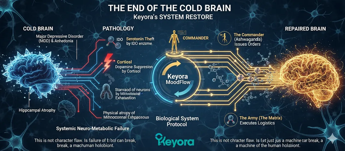 ![The conclusion confirms the systematic dismantling of MDD/Anhedonia pathology: Depression is a failure of Biology (Serotonin theft by IDO, Dopamine suppression by Cortisol, Mitochondrial Exhaustion, Hippocampal Atrophy). The Keyora MoodFlow Protocol is the Biological System Restore, utilizing the Commander (Ashwagandha) and the Matrix (Army) to repair Systemic Neuro-Metabolic Failure. [Image showing the interconnected failures of the IDO pathway, HPA axis, and hippocampal atrophy] The conclusion confirms the systematic dismantling of MDD/Anhedonia pathology: Depression is a failure of Biology (Serotonin theft by IDO, Dopamine suppression by Cortisol, Mitochondrial Exhaustion, Hippocampal Atrophy). The Keyora MoodFlow Protocol is the Biological System Restore, utilizing the Commander (Ashwagandha) and the Matrix (Army) to repair Systemic Neuro-Metabolic Failure. [Image showing the interconnected failures of the IDO pathway, HPA axis, and hippocampal atrophy]](https://www.keyorahealth.com/cdnfiles/2026/03/25072552/e7bb8fde-2fbc-4a81-a17a-84f42c009505_1536x672.webp)
