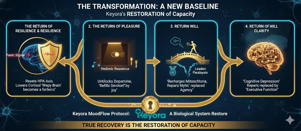 ![True recovery is the restoration of Capacity, not manic euphoria. Transformation involves 4 returns: Resilience (HPA Reset, "Weepy Brain" becomes a fortress); Pleasure (Dopamine Unblocked, Serotonin Refilled, Anhedonia replaced by Hedonic Resonance); Will (Mitochondria Recharged/Myelin Repaired, Avolition replaced by Agency); and Clarity (BDNF/Magnesium/Theanine lifts the fog, restoring Executive Function). [Image illustrating the four key areas of the brain being "turned on" (HPA, Reward Center, Mitochondria, Hippocampus)] True recovery is the restoration of Capacity, not manic euphoria. Transformation involves 4 returns: Resilience (HPA Reset, "Weepy Brain" becomes a fortress); Pleasure (Dopamine Unblocked, Serotonin Refilled, Anhedonia replaced by Hedonic Resonance); Will (Mitochondria Recharged/Myelin Repaired, Avolition replaced by Agency); and Clarity (BDNF/Magnesium/Theanine lifts the fog, restoring Executive Function). [Image illustrating the four key areas of the brain being "turned on" (HPA, Reward Center, Mitochondria, Hippocampus)]](https://www.keyorahealth.com/cdnfiles/2026/03/25072554/1e13031e-9bcf-40f5-aadf-bada4702eca0_1536x672.webp)