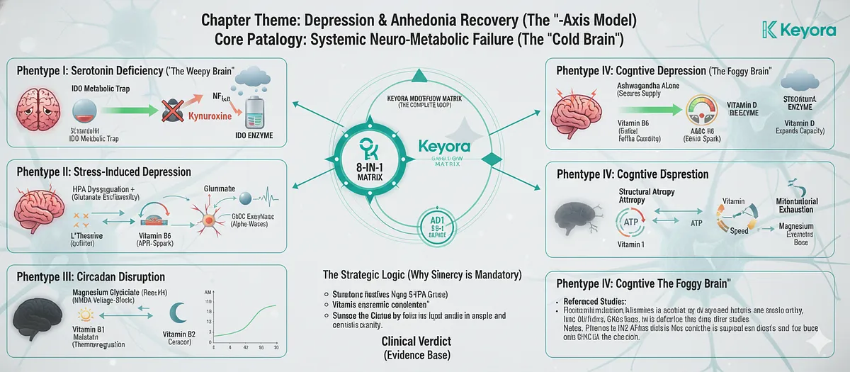 ![The Keyora Tri-Axis Model addresses Systemic Neuro-Metabolic Failure ("Cold Brain"). It targets 4 Phenotypes: I (IDO/Serotonin), II (HPA/Glutamate), III (CAR/Circadian), and IV (BDNF/ATP). The 8-in-1 Matrix is mandatory due to the Fuel Paradox (Needs 5-HTP), Protection Paradox (Needs Magnesium), and Enzymatic Lock (Needs B6/B1/B12). Evidence: -27.9% Cortisol (Chandrasekhar), 5-HTP Superior Bioavailability (Shaw), and Antidepressant Parity (Bhattacharya). [Image summarizing the 4 depression phenotypes and their corresponding Keyora solutions] The Keyora Tri-Axis Model addresses Systemic Neuro-Metabolic Failure ("Cold Brain"). It targets 4 Phenotypes: I (IDO/Serotonin), II (HPA/Glutamate), III (CAR/Circadian), and IV (BDNF/ATP). The 8-in-1 Matrix is mandatory due to the Fuel Paradox (Needs 5-HTP), Protection Paradox (Needs Magnesium), and Enzymatic Lock (Needs B6/B1/B12). Evidence: -27.9% Cortisol (Chandrasekhar), 5-HTP Superior Bioavailability (Shaw), and Antidepressant Parity (Bhattacharya). [Image summarizing the 4 depression phenotypes and their corresponding Keyora solutions]](https://www.keyorahealth.com/cdnfiles/2026/03/25072559/70774630-82dd-4b3b-8600-e4475103a29a_1536x672.webp)