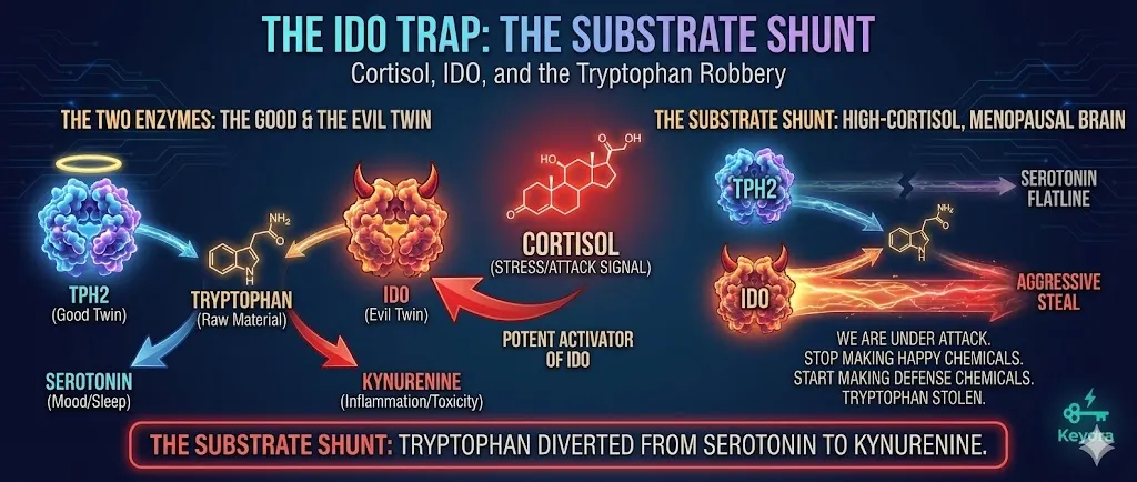 – *The Trigger*: High **Cortisol** & Inflammation activate IDO.
