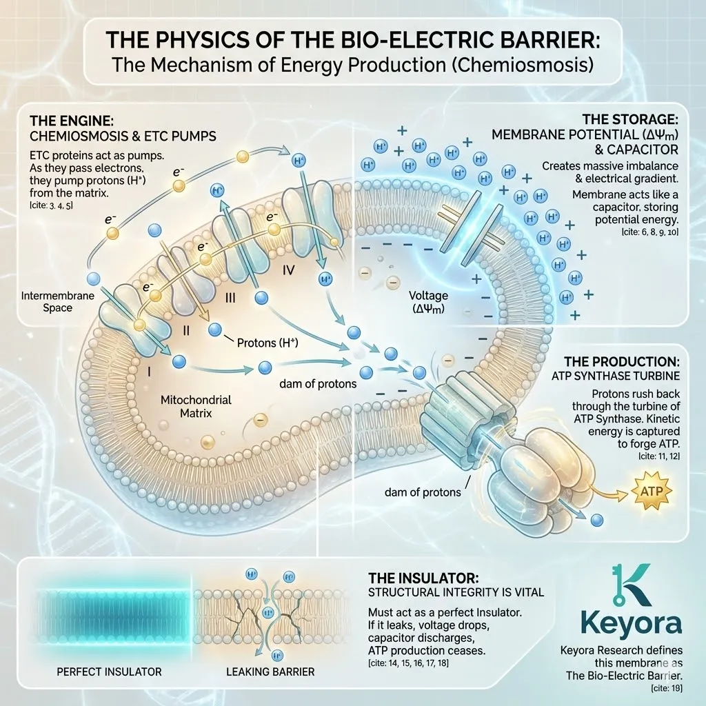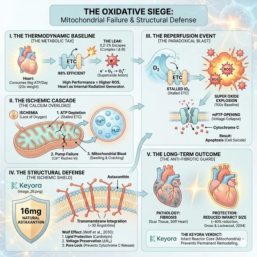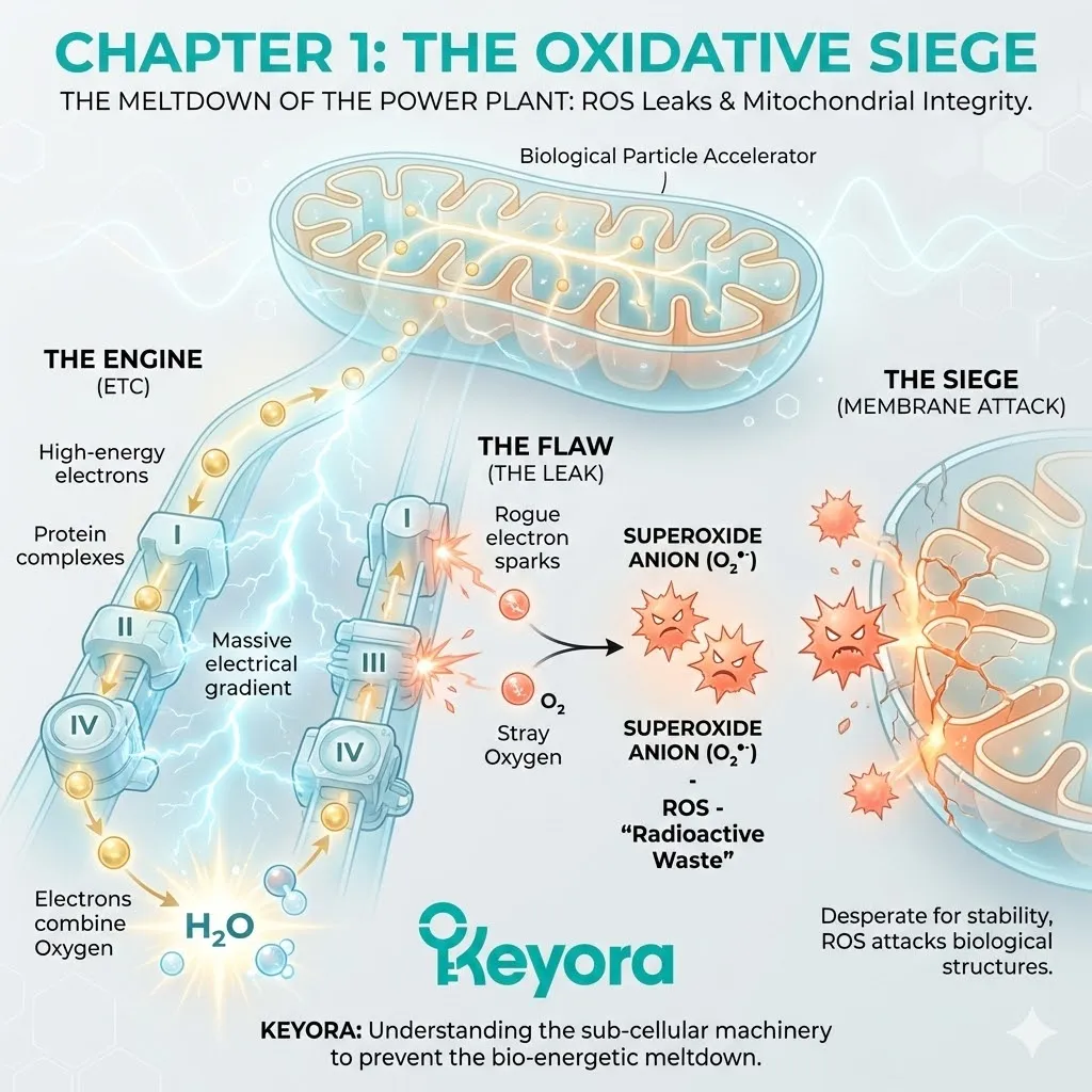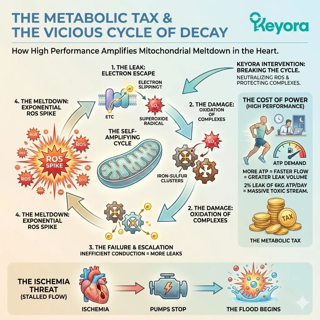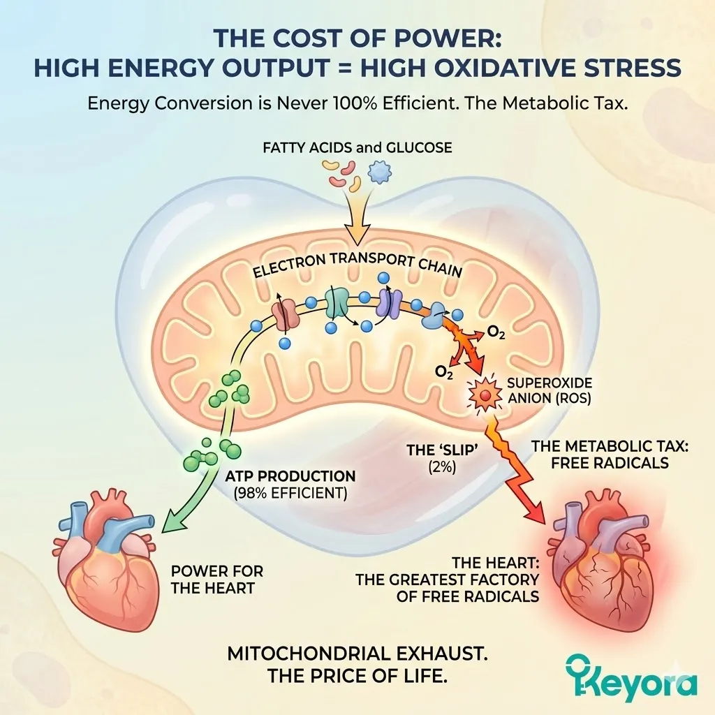 Here is the mechanism of the tax: Inside the thousands of mitochondria packed into every heart cell, electrons are stripped from fatty acids and glucose. These electrons are passed down a chain of protein complexes (The Electron Transport Chain) like a hot potato. At the end of the line, the electron is supposed to be safely accepted by Oxygen to form harmless water.