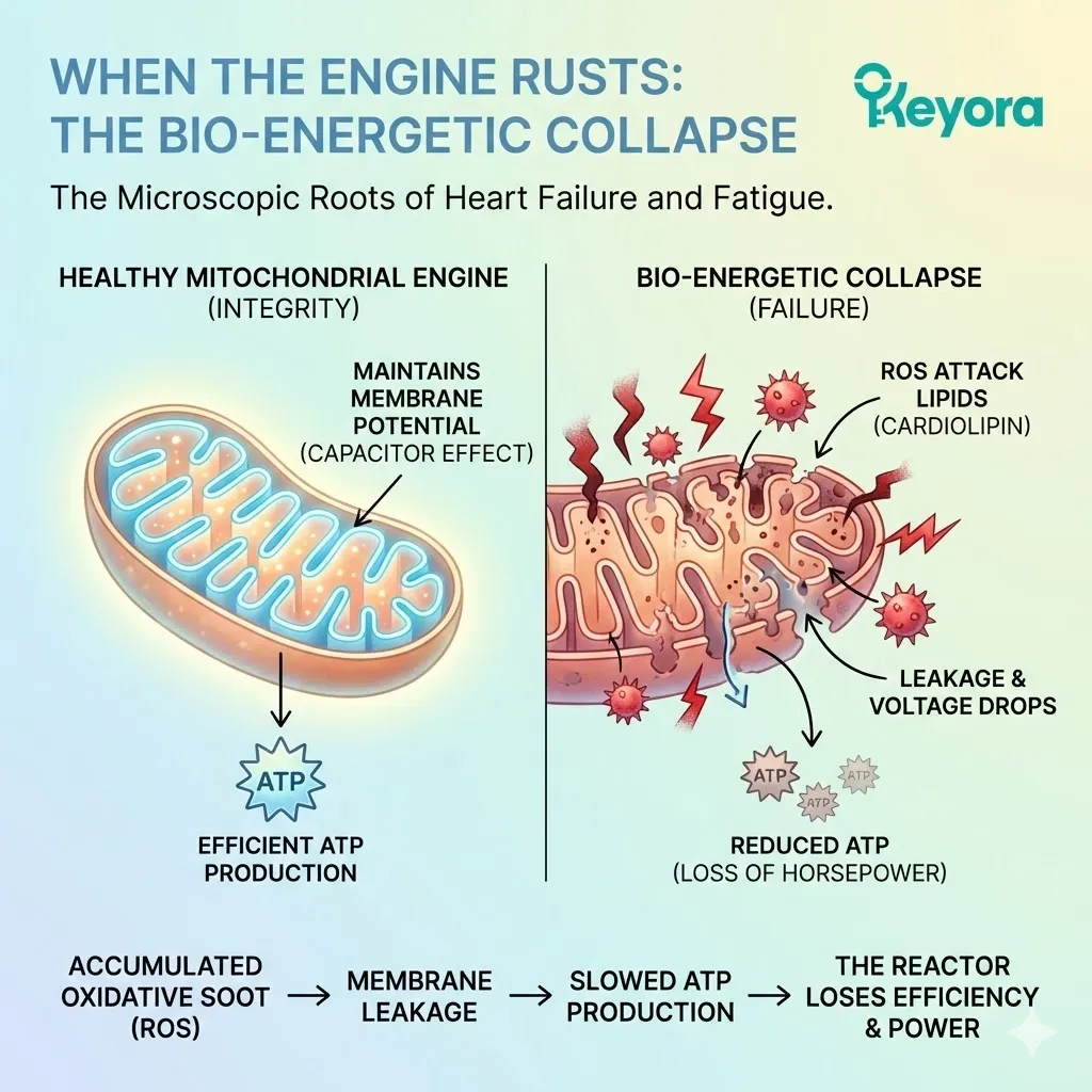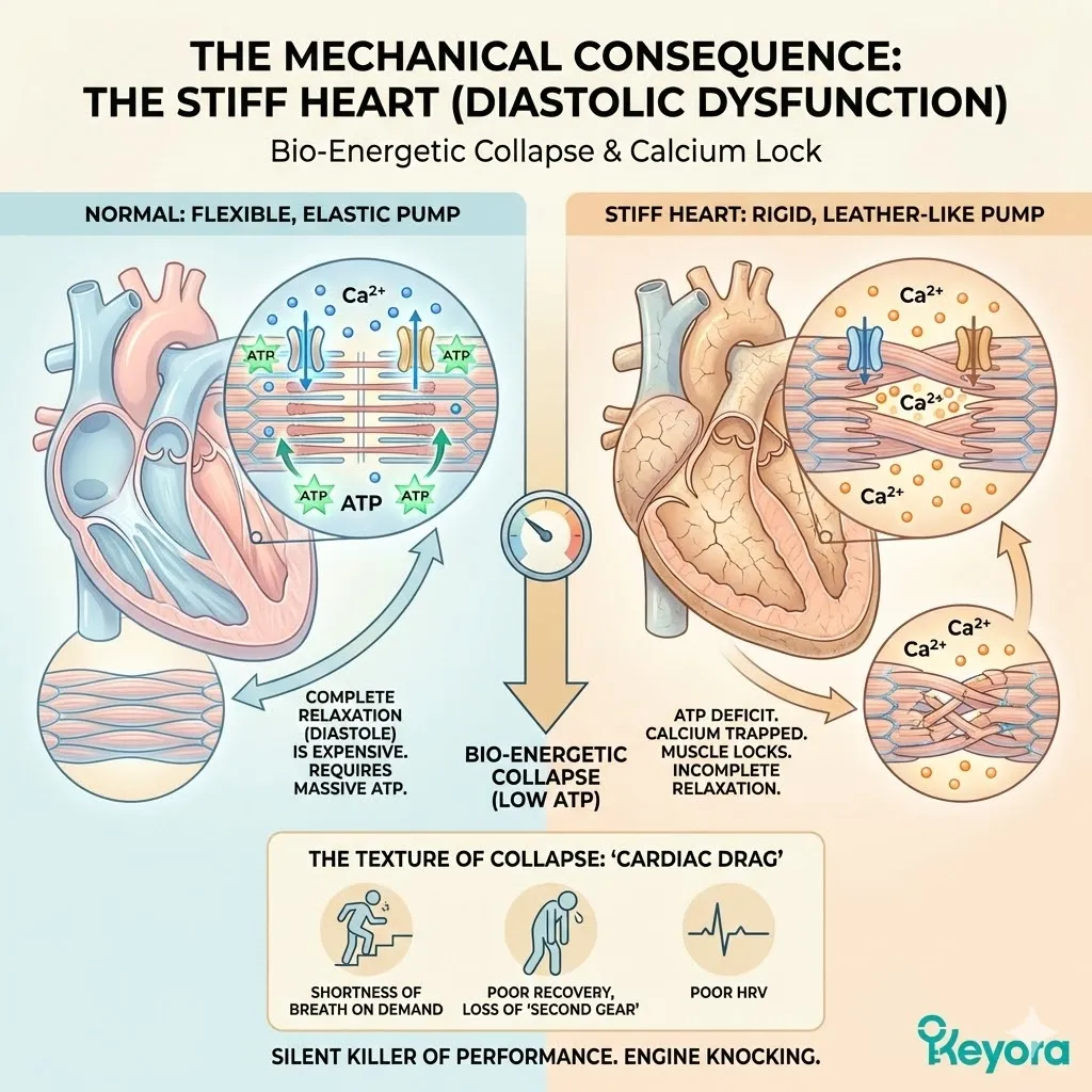 If this debt is not paid – if the oxidative rust is not cleared – the mitochondria begin to fail. The reactor core loses containment. And when the heart’s energy supply drops, the heart does not just stop; it stiffens. It begins the slow, tragic slide into dysfunction.