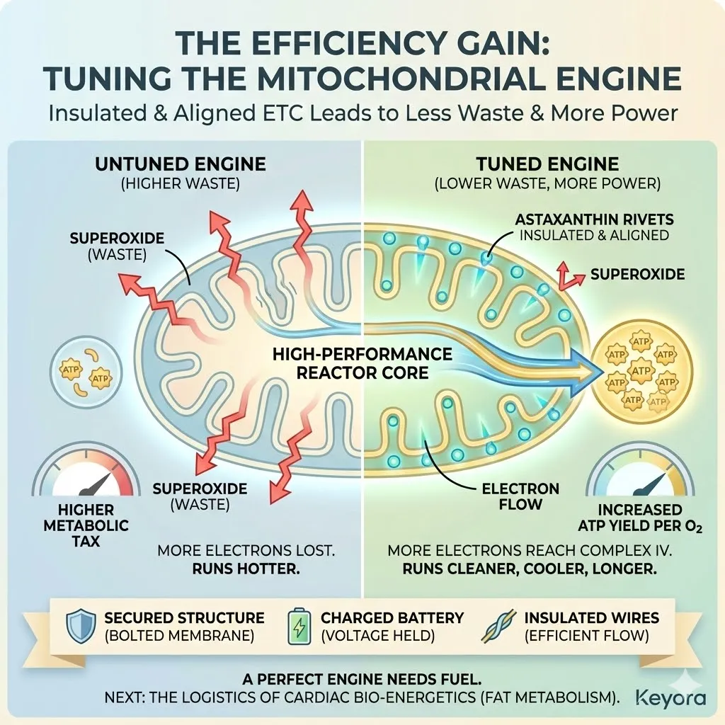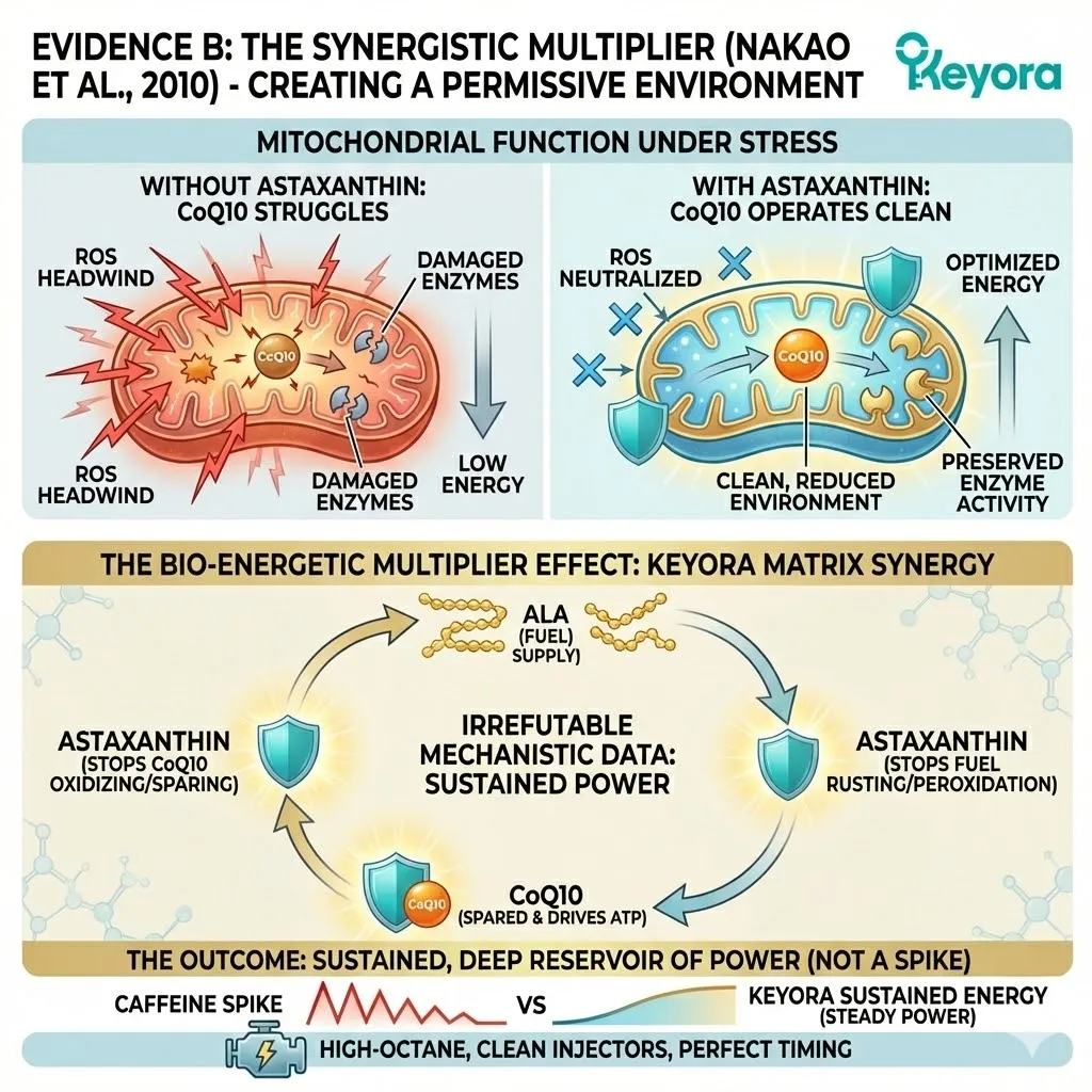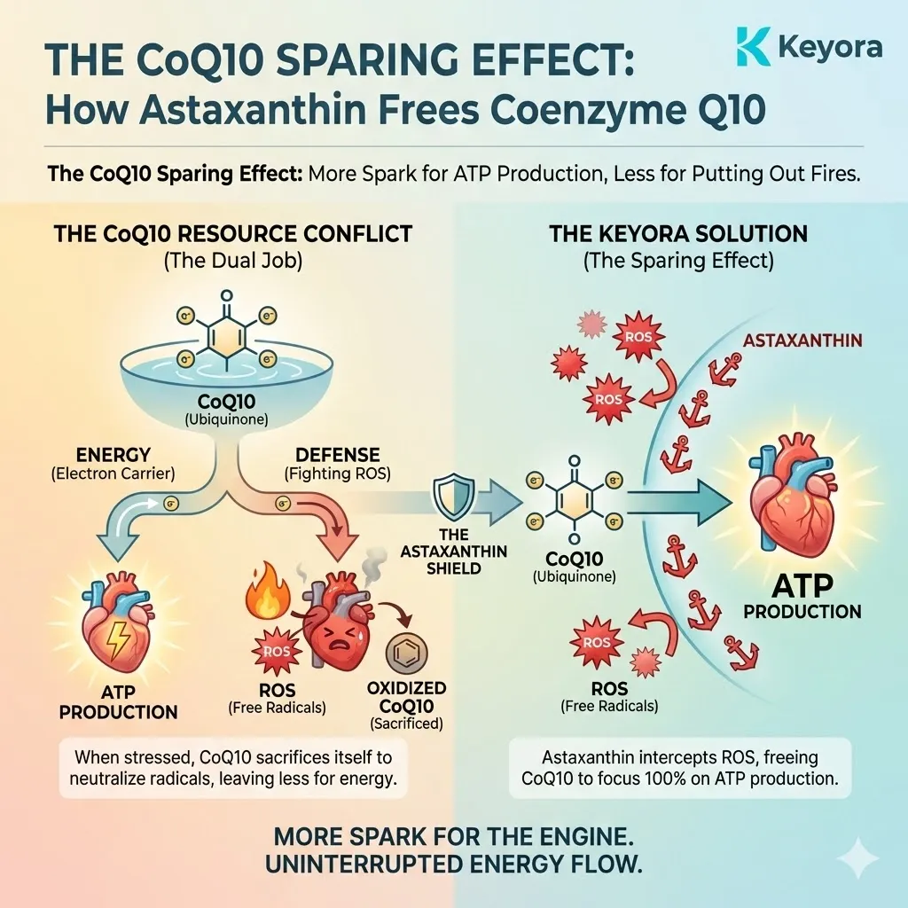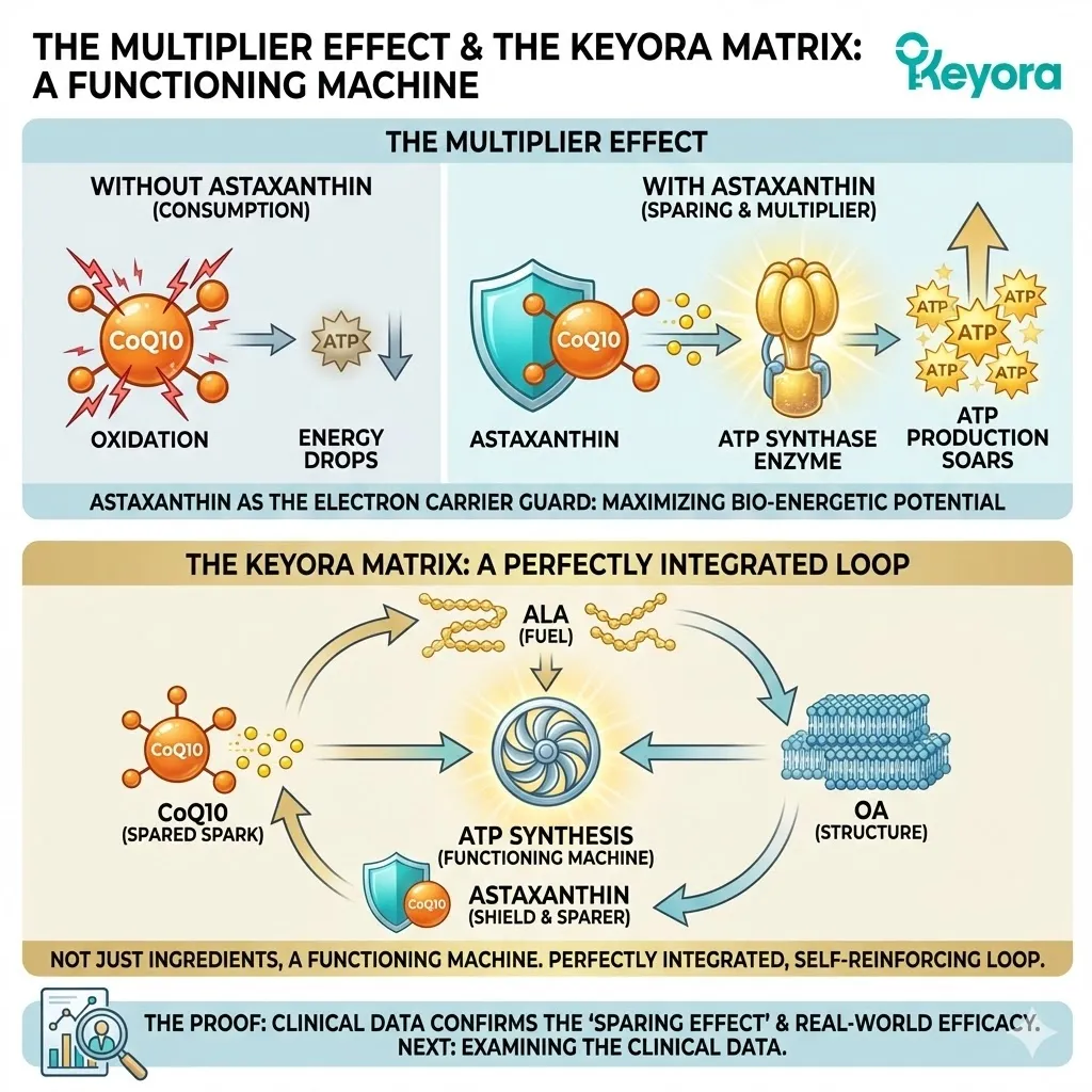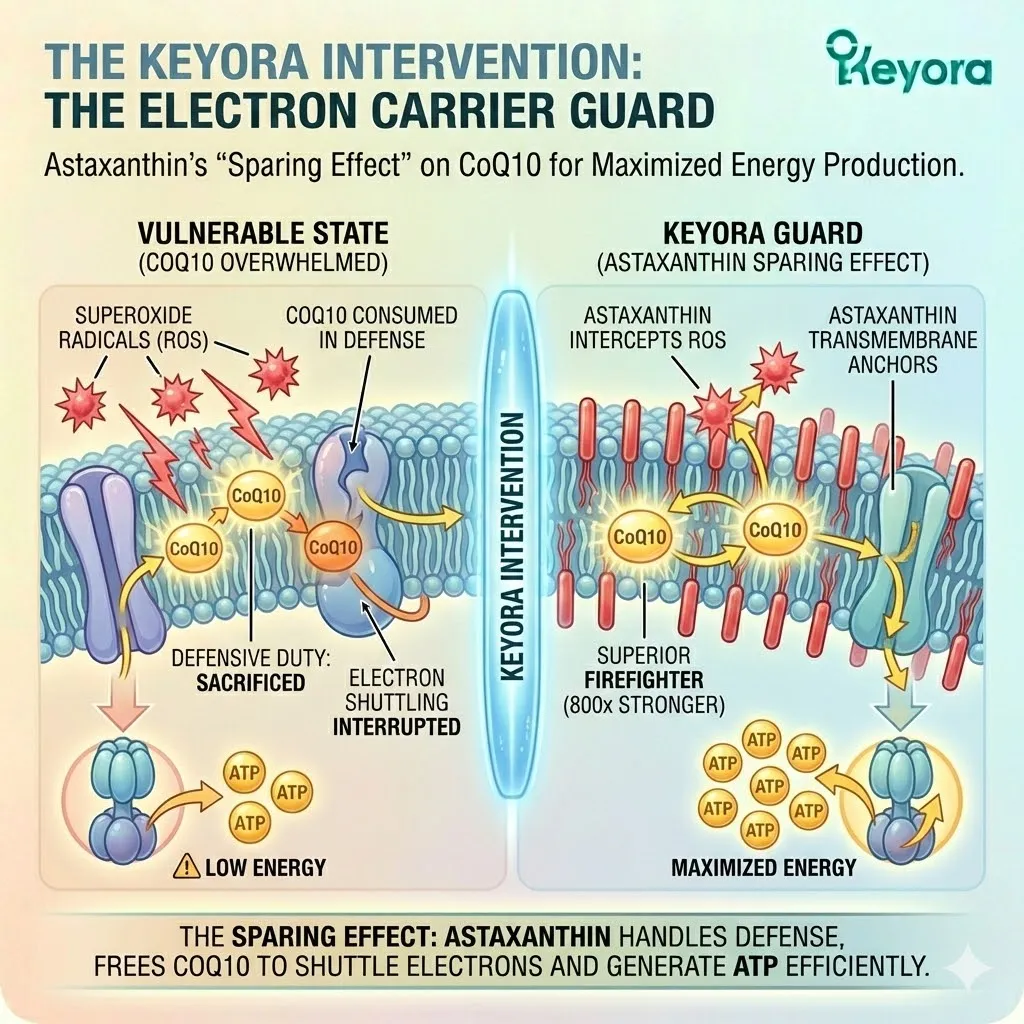 * **The Synergy:** Astaxanthin acts as **[The Electron Carrier Guard]**, sparing CoQ10 from antioxidant duties so it can focus on ATP synthesis.