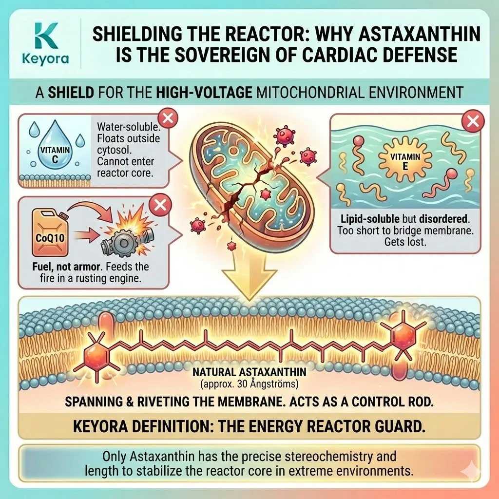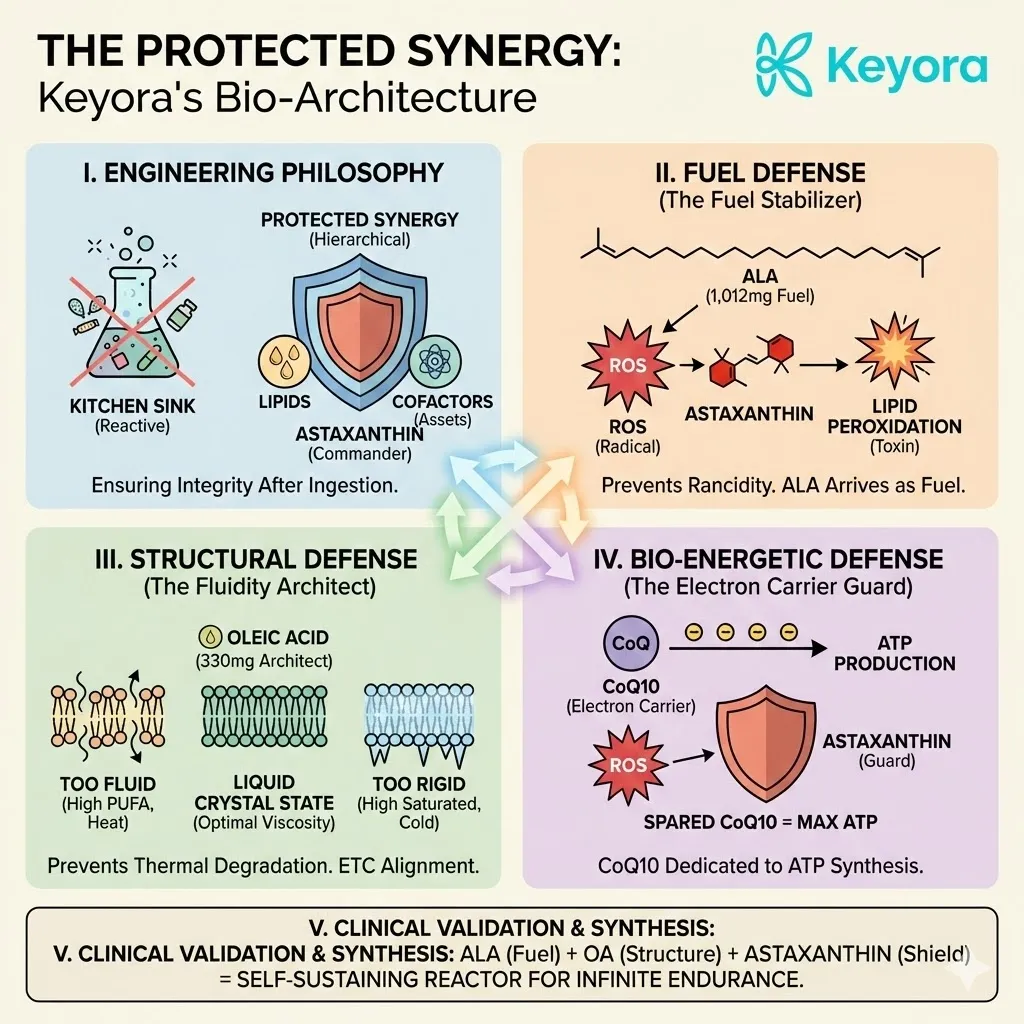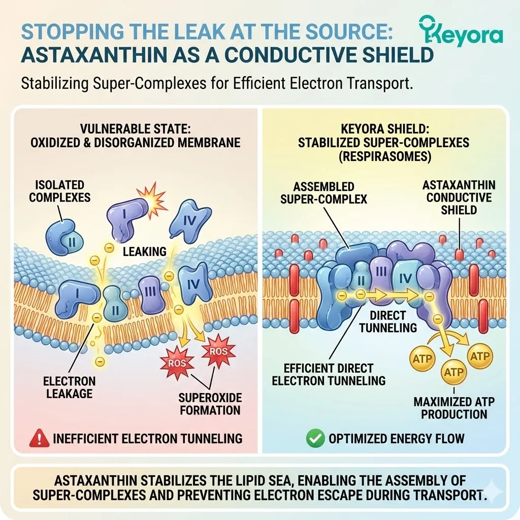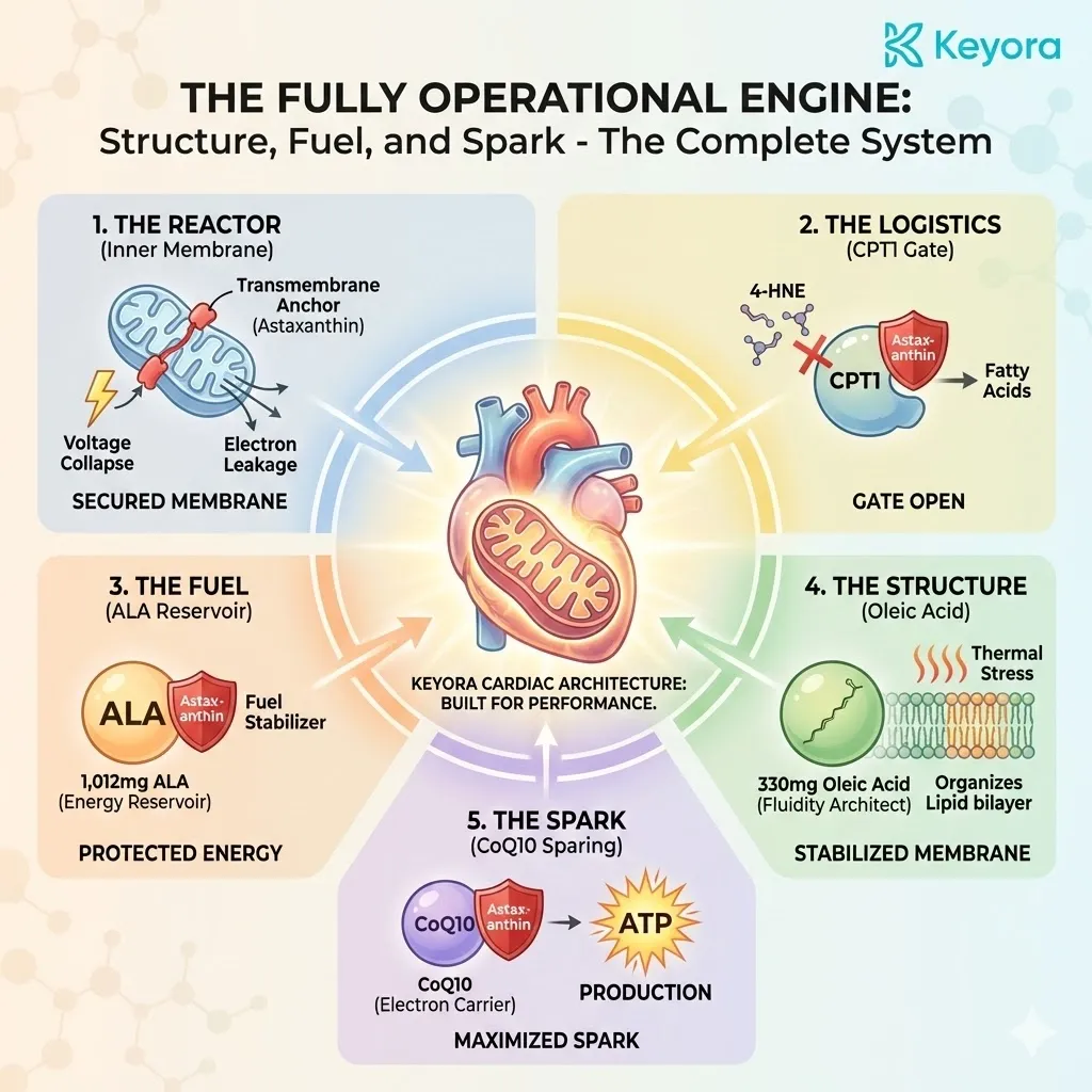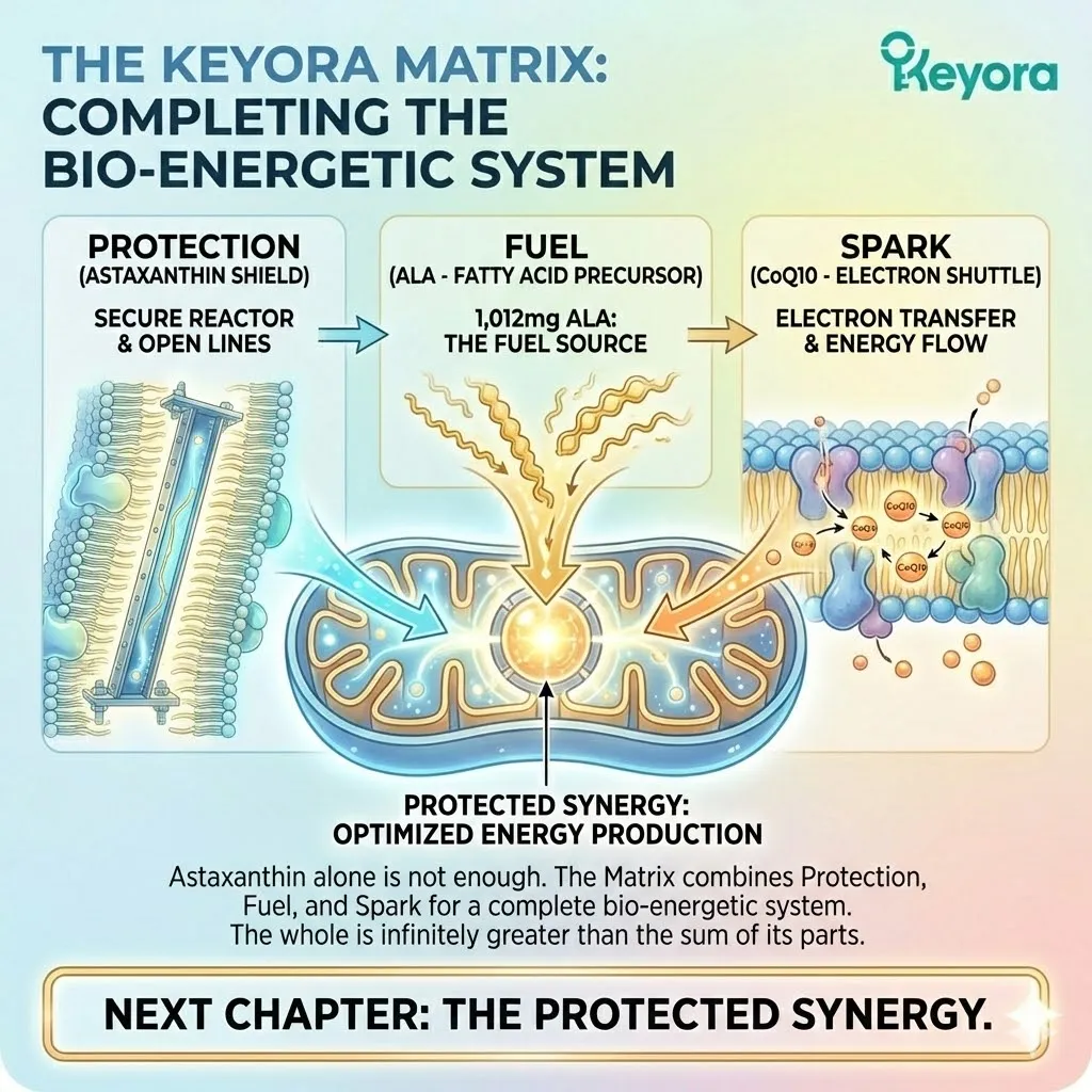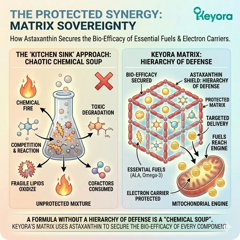 * **The Synergy:** Astaxanthin acts as **[The Electron Carrier Guard]**, sparing CoQ10 from antioxidant duties so it can focus on ATP synthesis.
