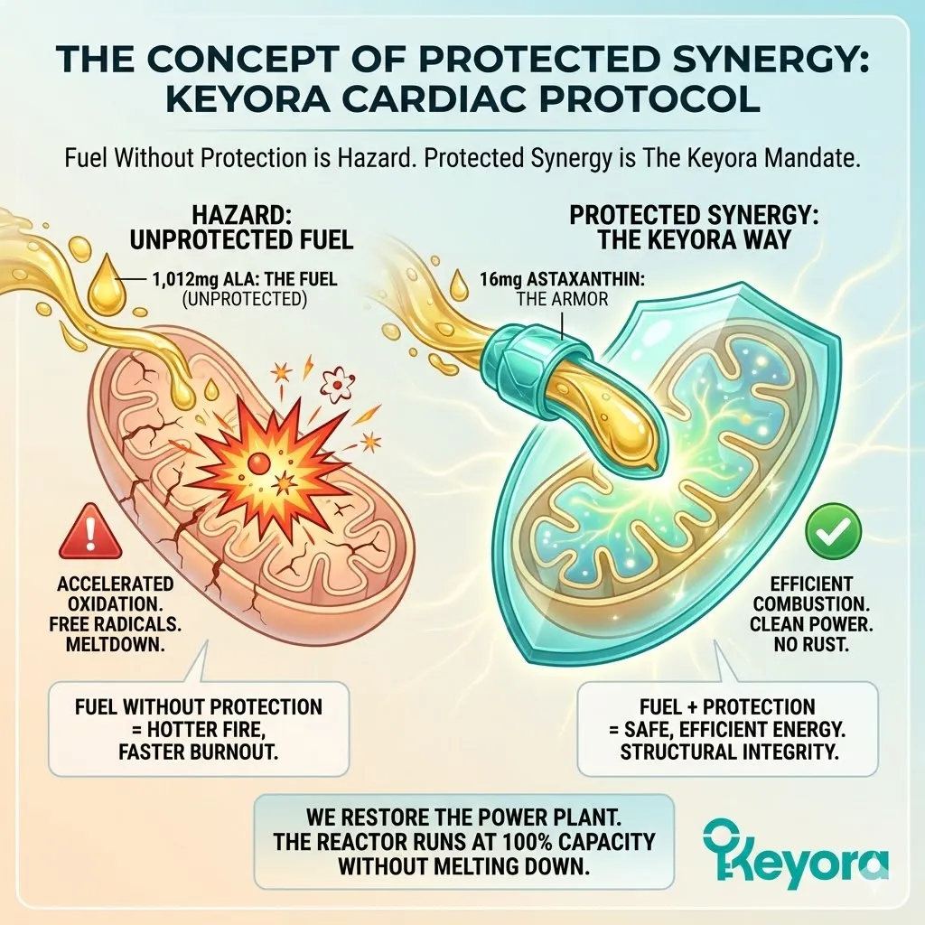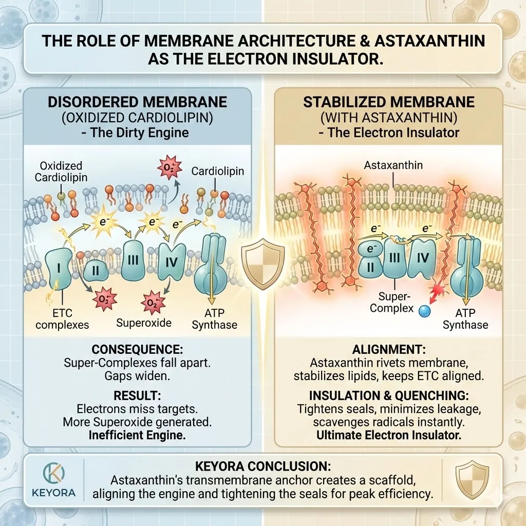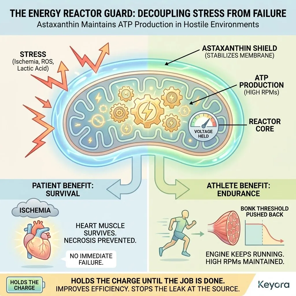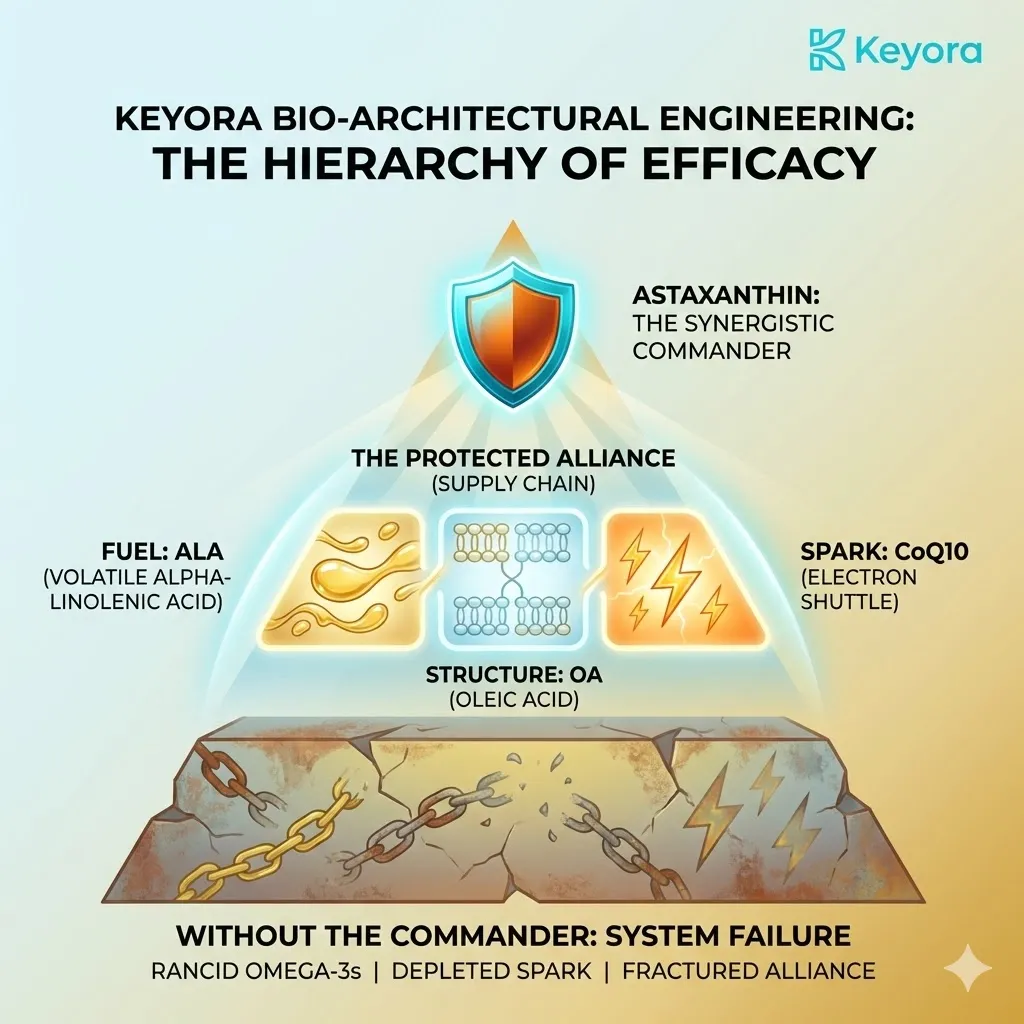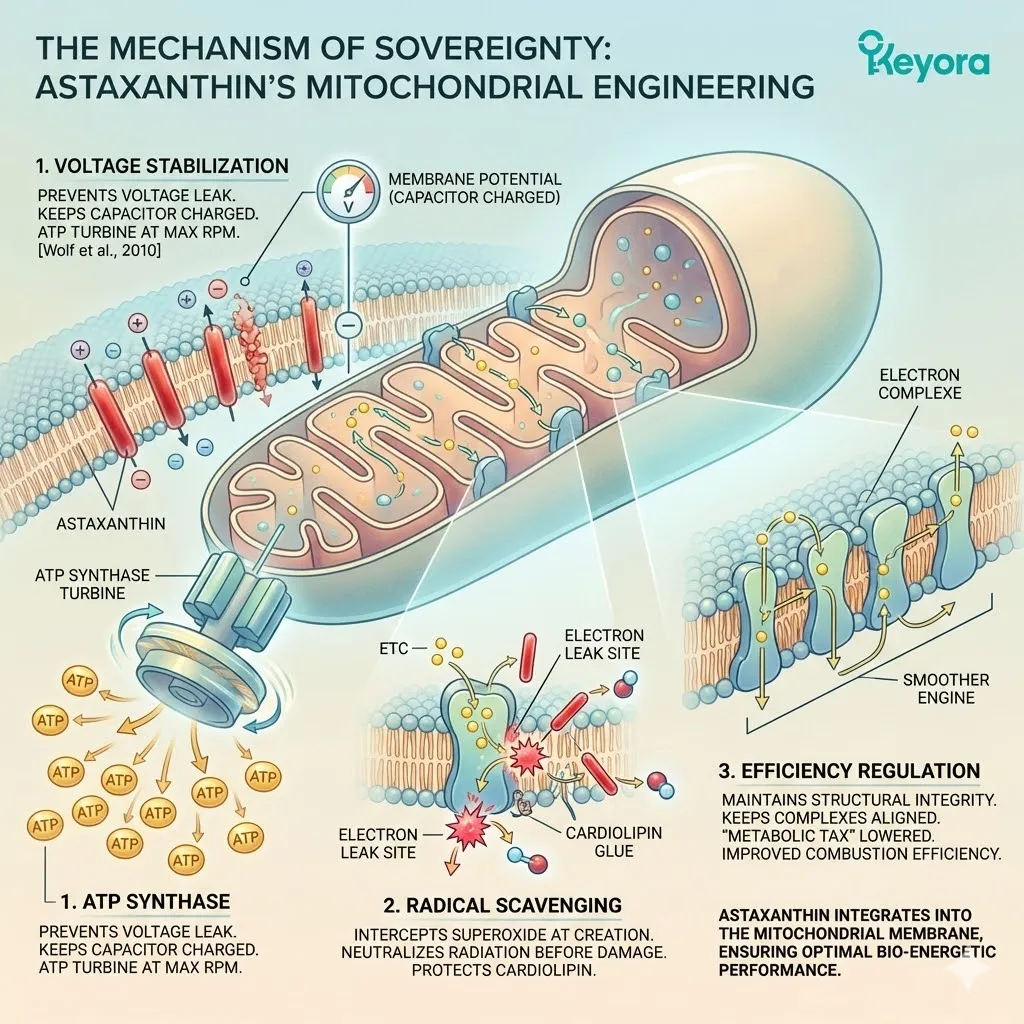 * **The Synergy:** Astaxanthin acts as **[The Electron Carrier Guard]**, sparing CoQ10 from antioxidant duties so it can focus on ATP synthesis.