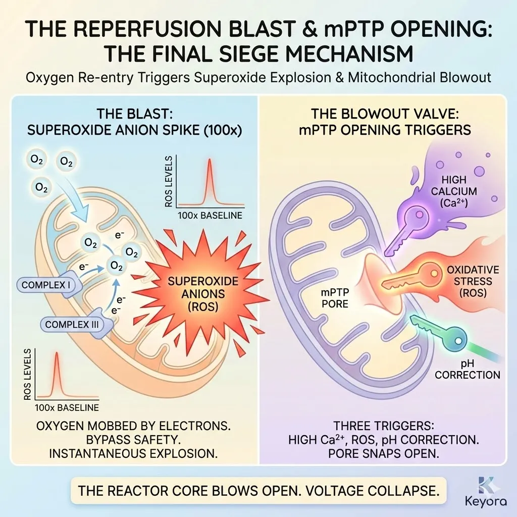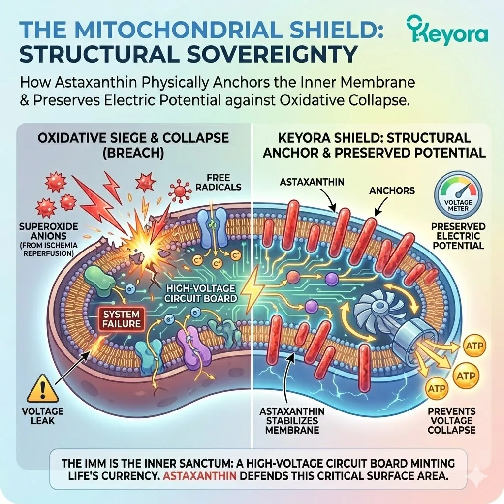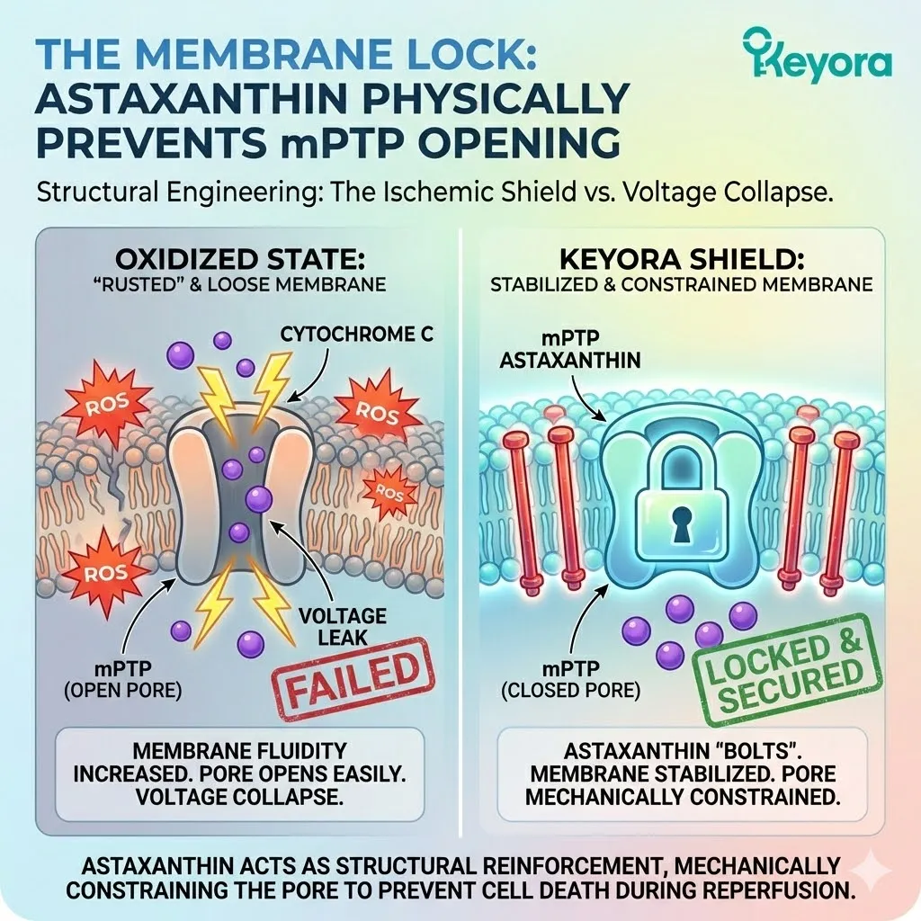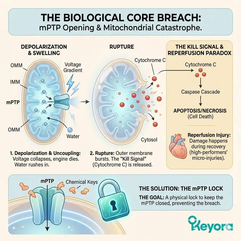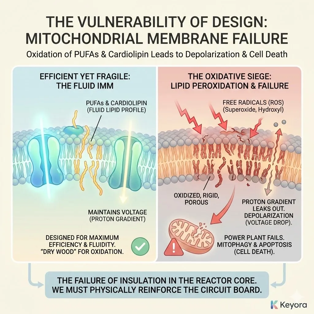 * **The Threat:** Lipid Peroxidation of **Cardiolipin** $rightarrow$ Membrane Depolarization (Voltage Drop) $rightarrow$ **mPTP Opening** $rightarrow$ Cell Death.