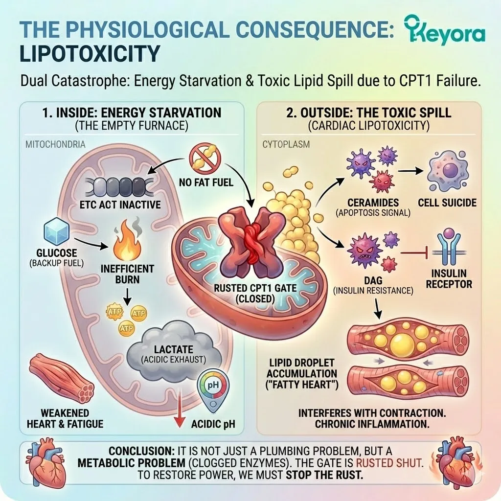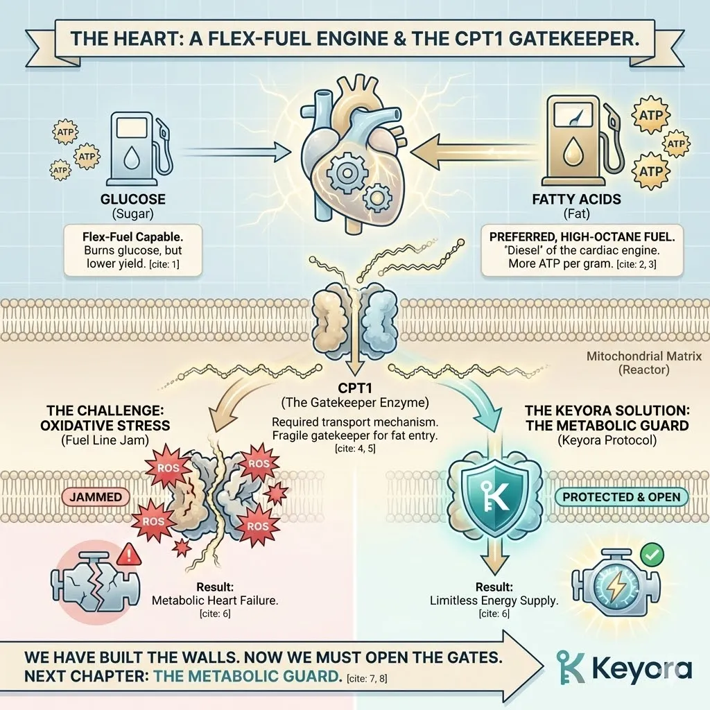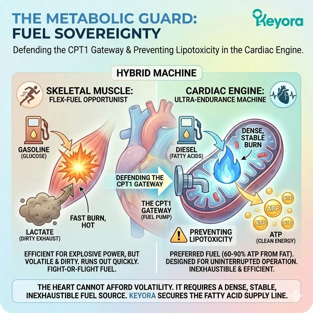 * **The Consequence:** **Metabolic Inflexibility**. The heart cannot burn fat (”Diesel”) and must rely on inefficient glucose (”Gasoline”), leading to lactate buildup.