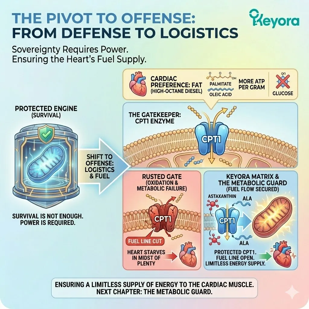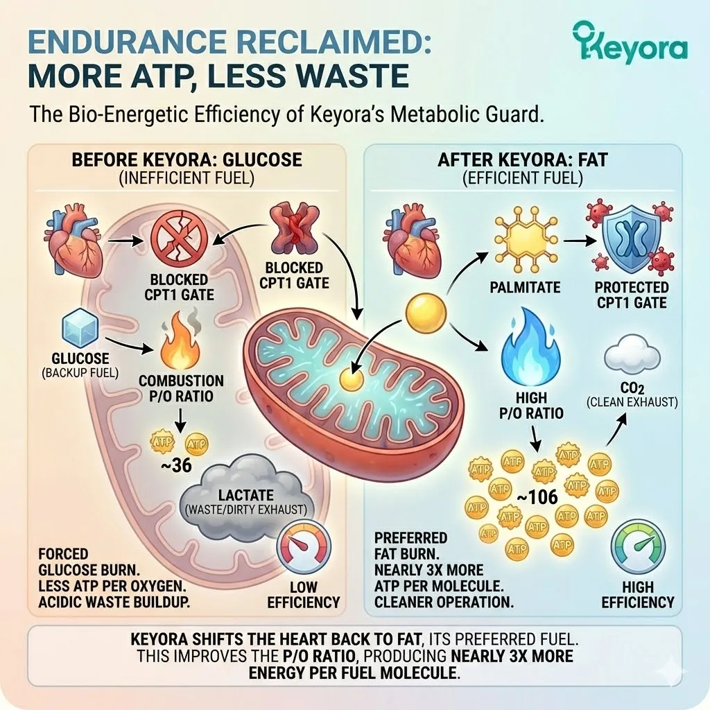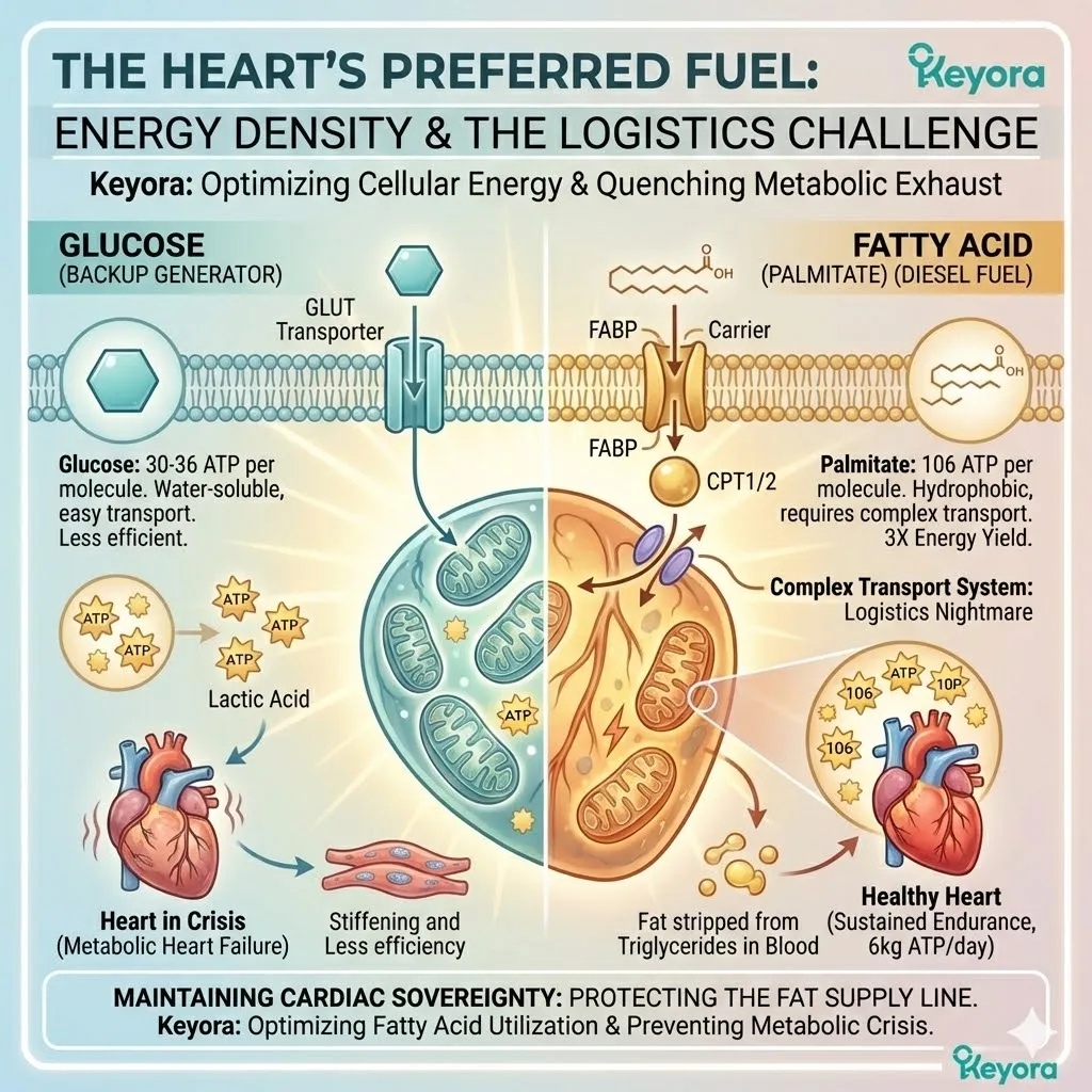 * **The Consequence:** **Metabolic Inflexibility**. The heart cannot burn fat (”Diesel”) and must rely on inefficient glucose (”Gasoline”), leading to lactate buildup.