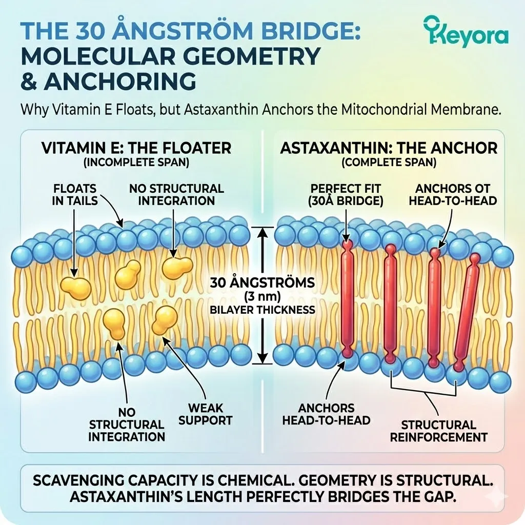 * Astaxanthin spans the 30 Ångström bilayer.