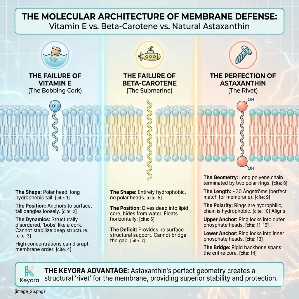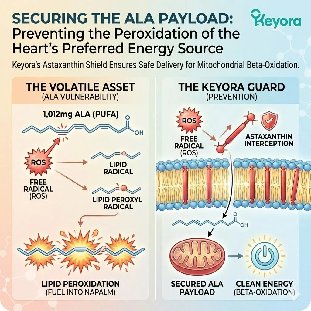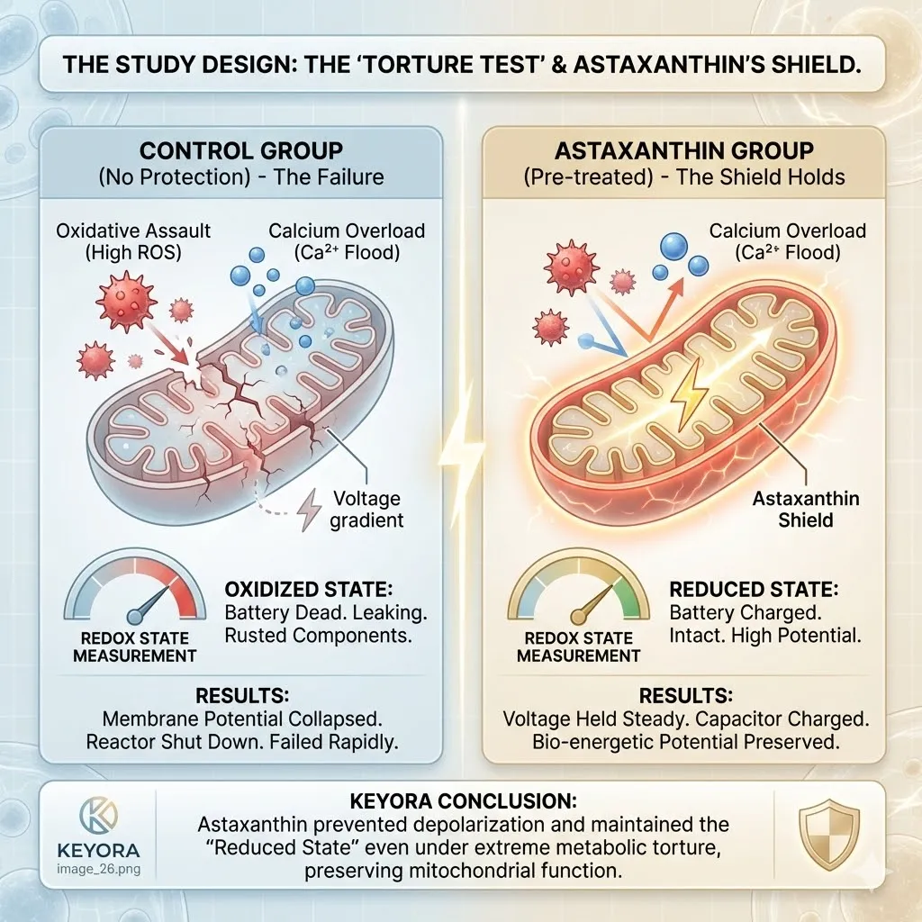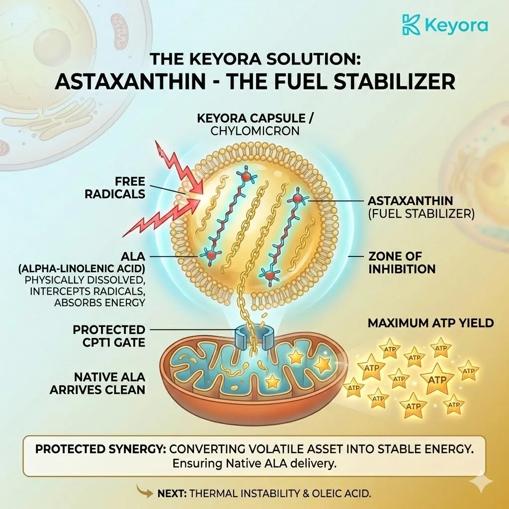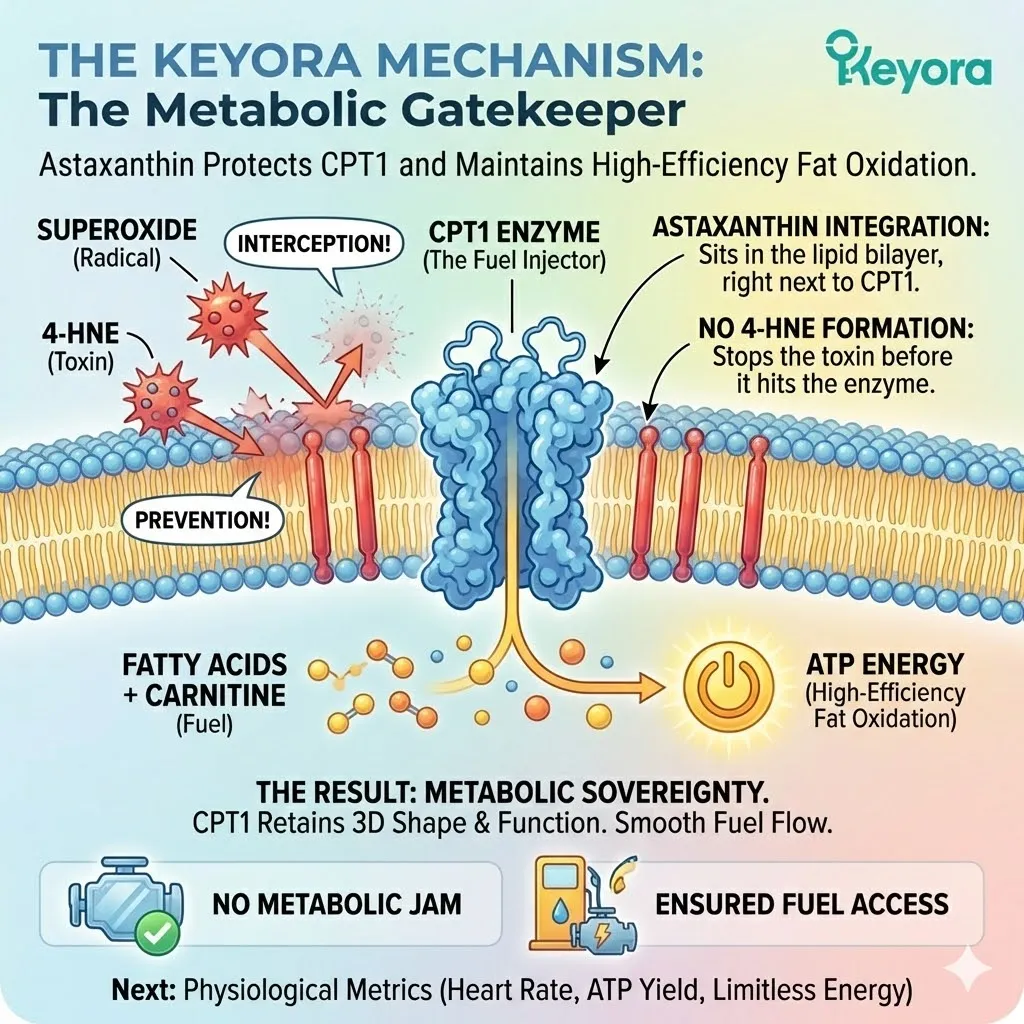 * **The Mechanism:** Astaxanthin intercepts ROS at the membrane surface, preventing 4-HNE formation.