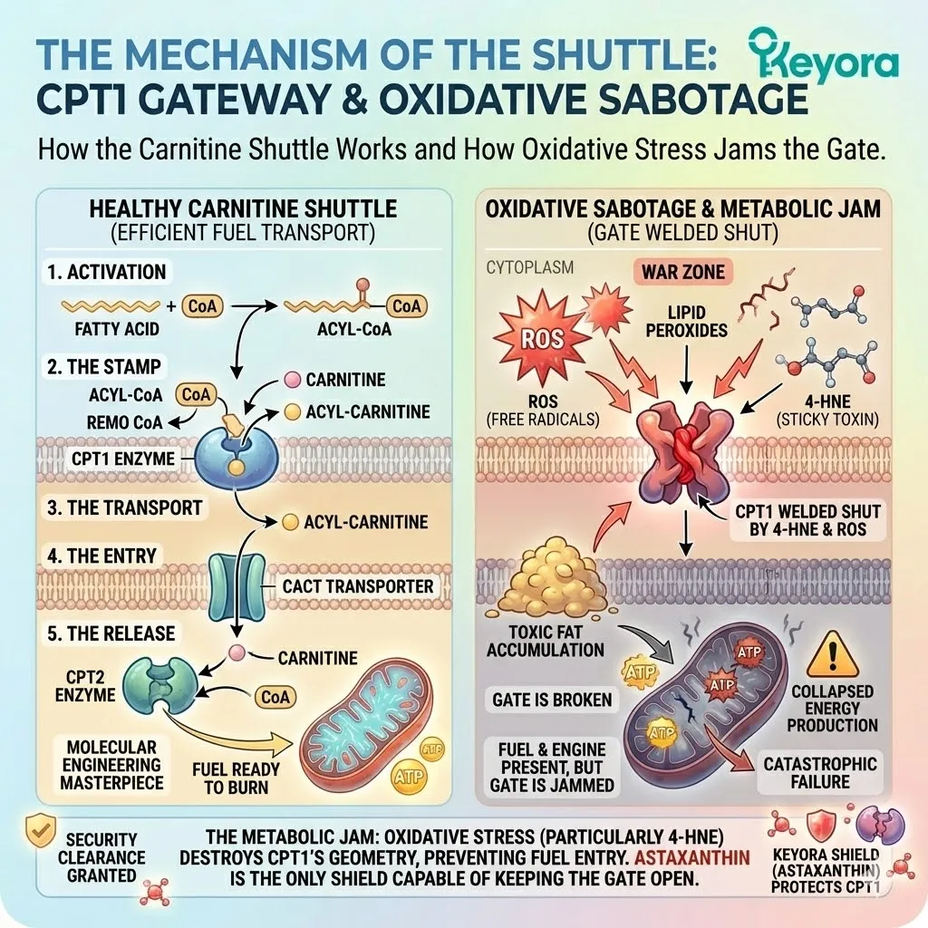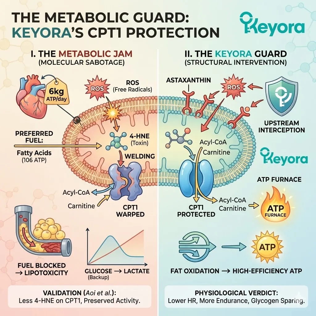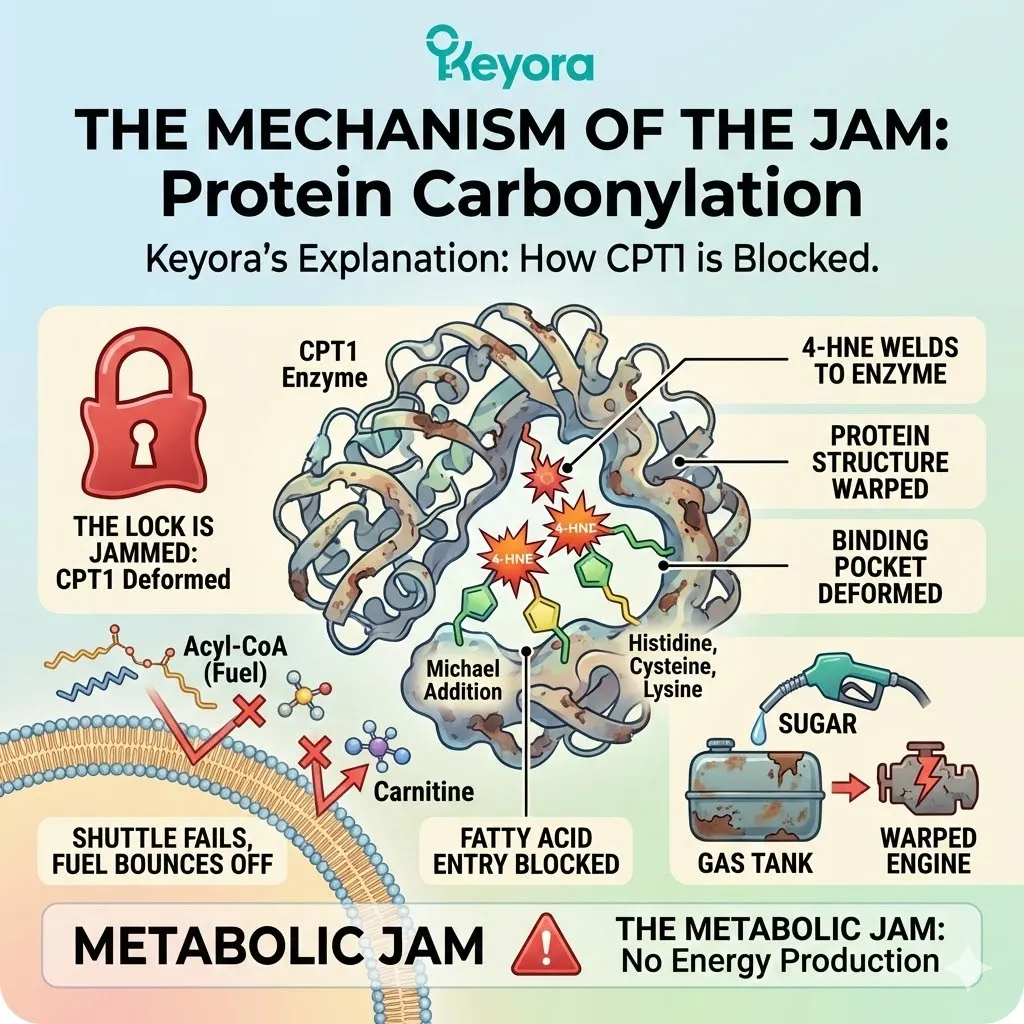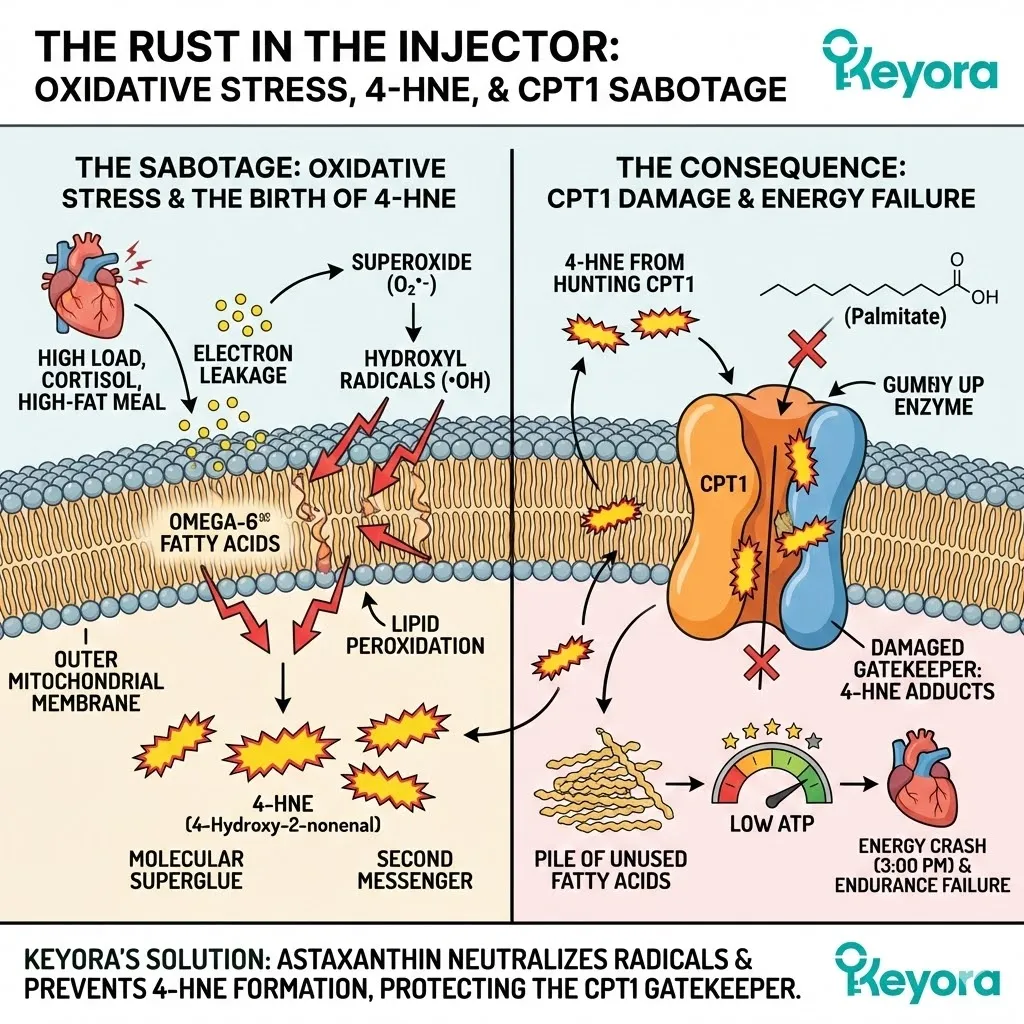 * ROS oxidizes Omega-6 lipids $rightarrow$ 4-HNE $rightarrow$ Carbonylates CPT1 $rightarrow$ Gate jams shut.