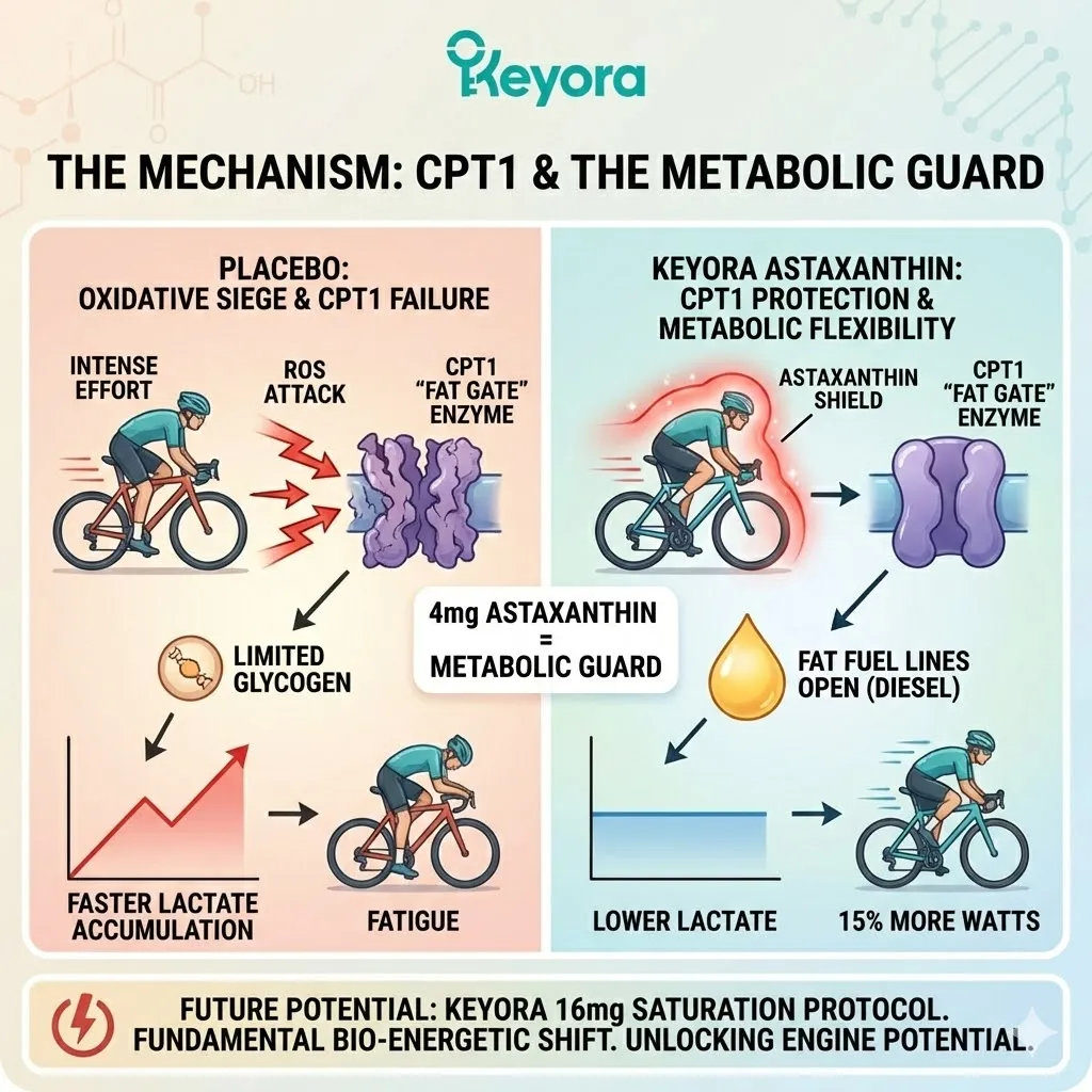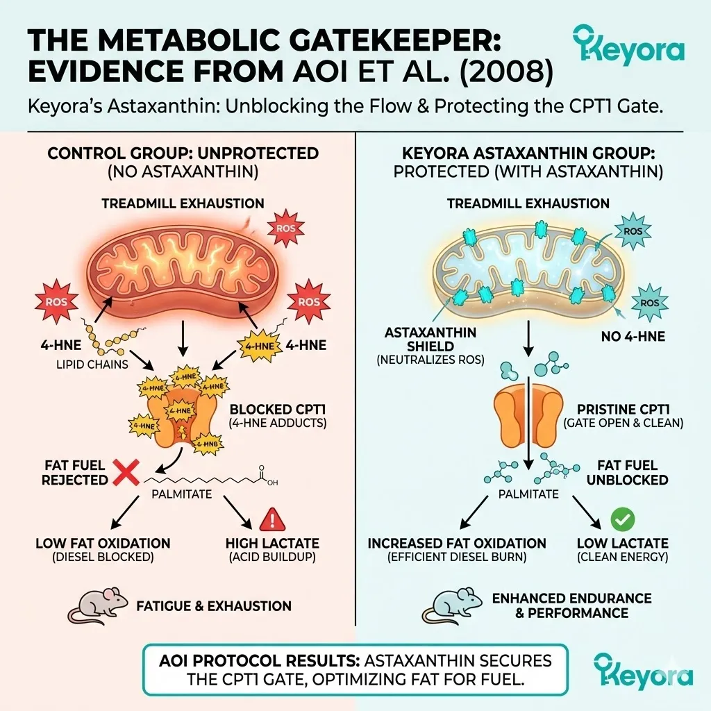 * **The Evidence (Aoi et al., 2008):** Preserved CPT1 function $rightarrow$ Increased Fat Oxidation $rightarrow$ Reduced Lactate accumulation.