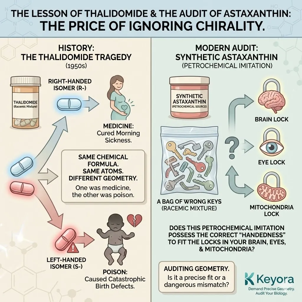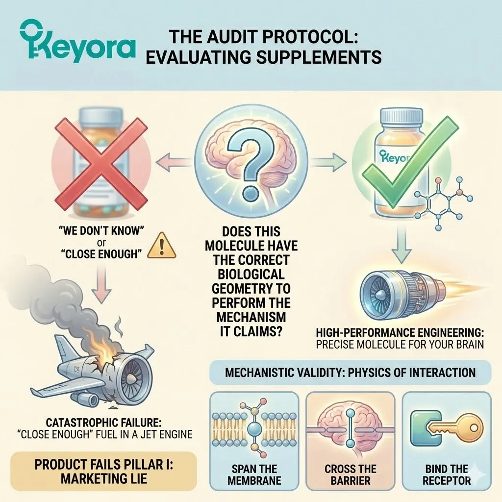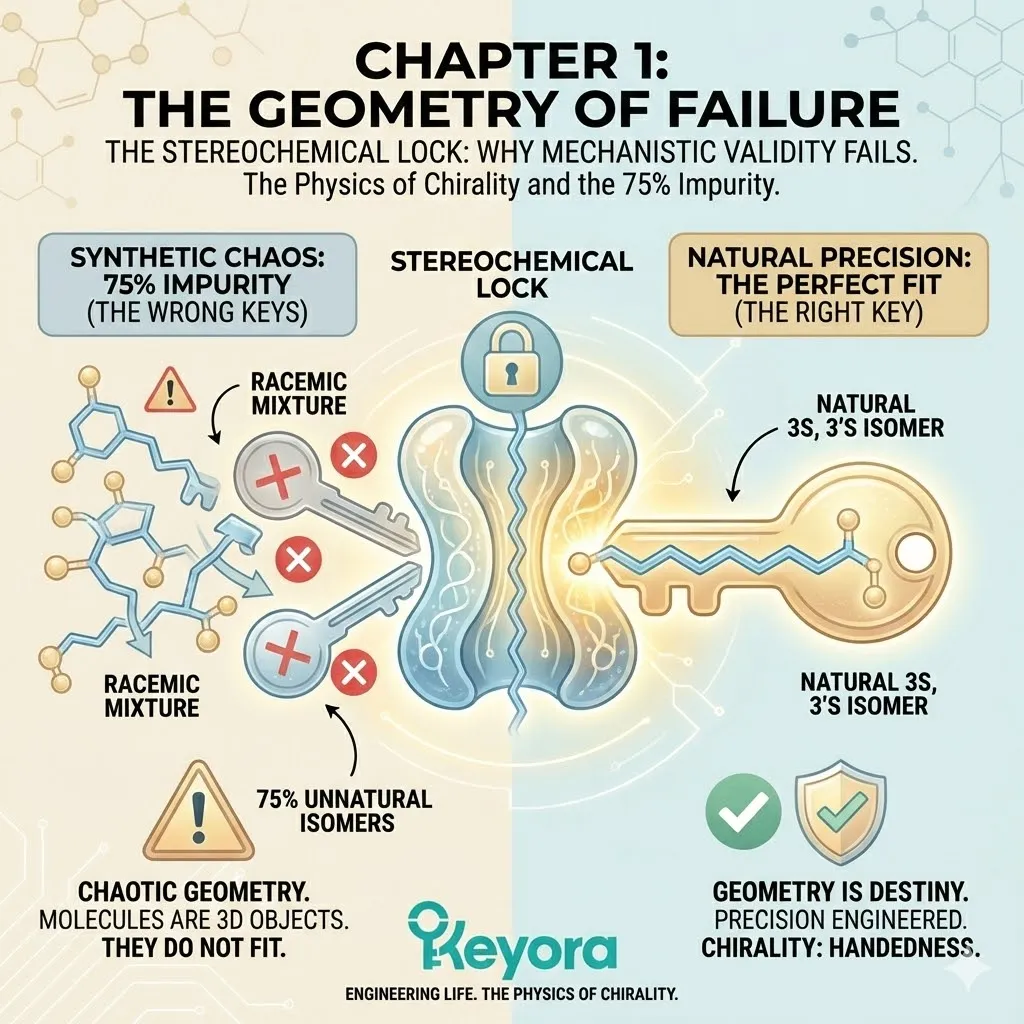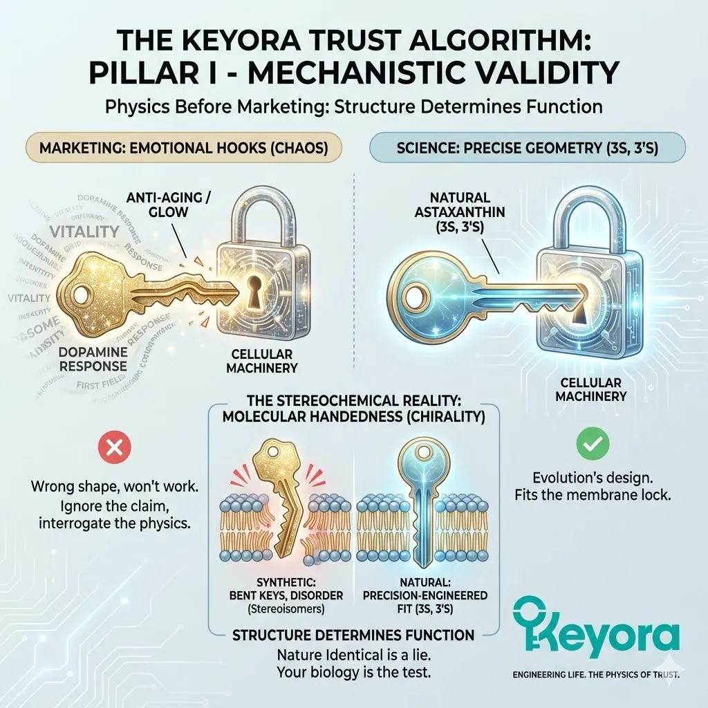 The Audit: Marketing claims “what” it does. Science asks “how.” If the molecular shape (stereochemistry) is wrong, the mechanism fails. Physics does not care about your marketing budget.
