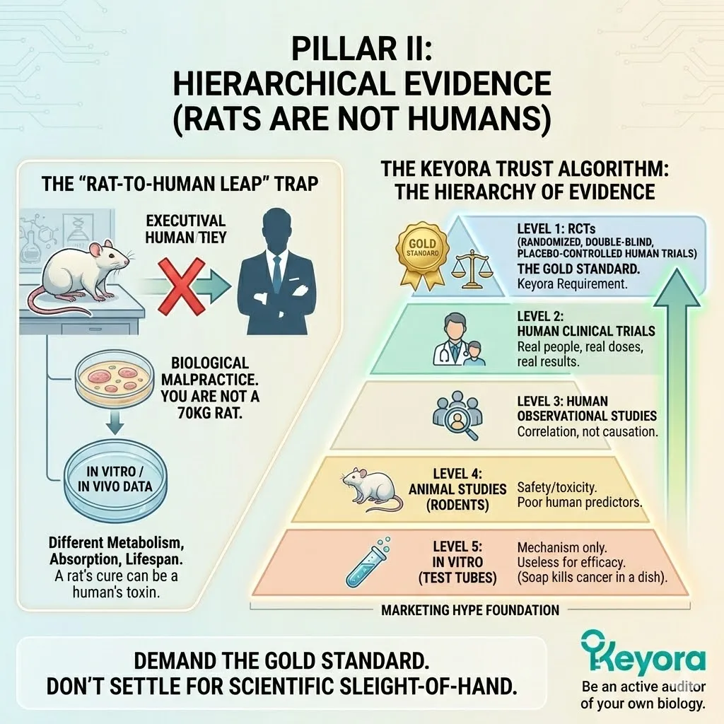 The Audit: We reject the “Rat-to-Human Leap.” If a product claims to fix your brain but only cites a study done on a petri dish, it fails the audit. We demand the hierarchy of evidence, culminating in human Randomized Controlled Trials (RCTs).