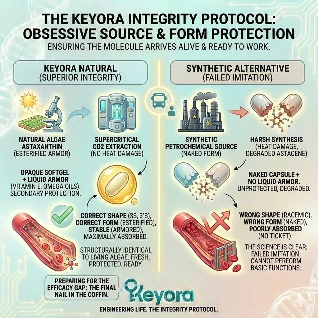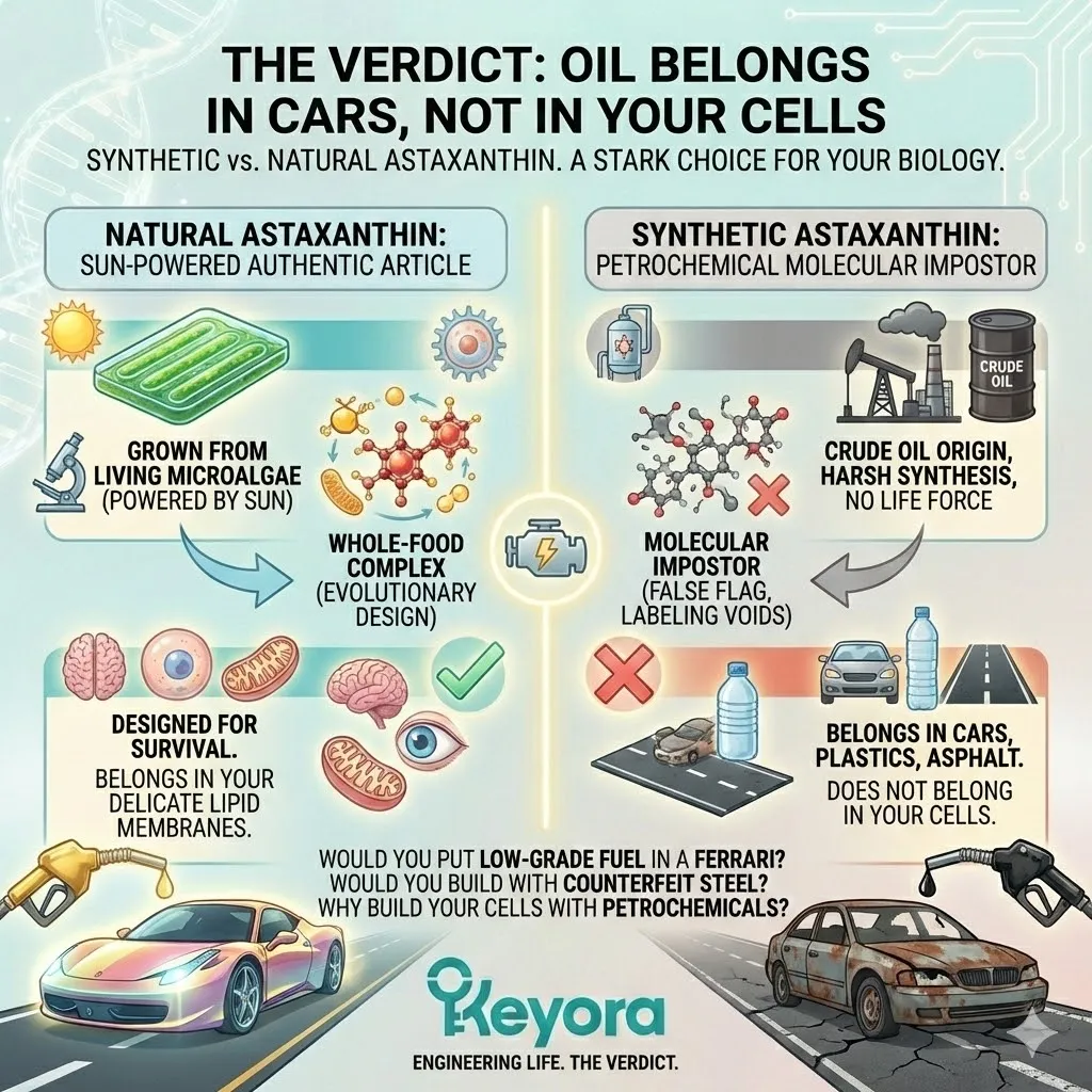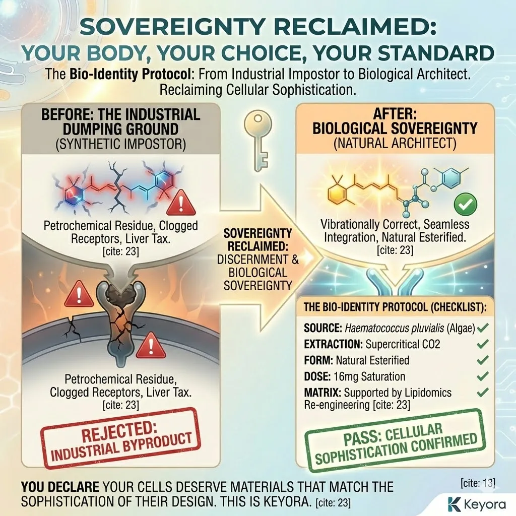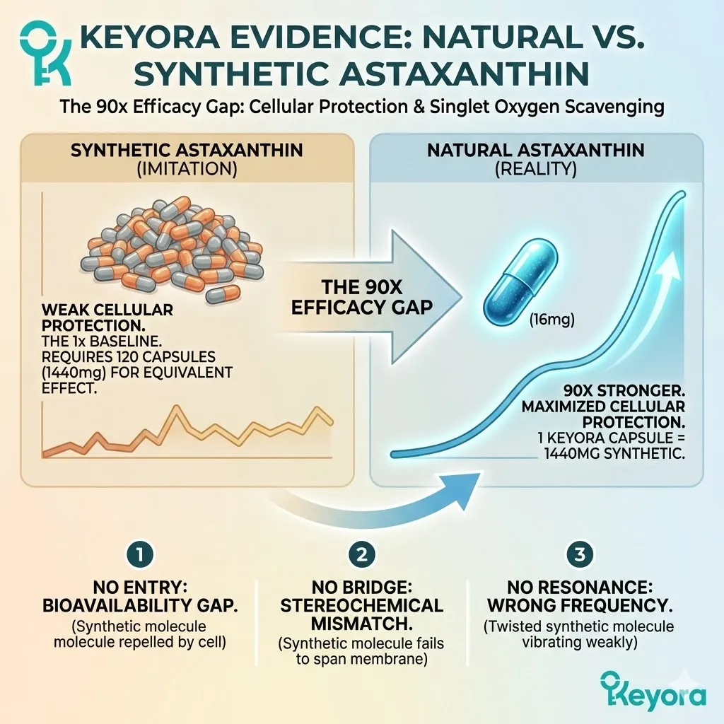 You understand that “Astaxanthin” is not a commodity. It is a spectrum. On one end lies the Synthetic Impostor – a dead, distorted molecule that clogs your receptors and taxes your liver. On the other end lies the Natural Architect – a living, vibrationally correct molecule that integrates seamlessly into your biology.