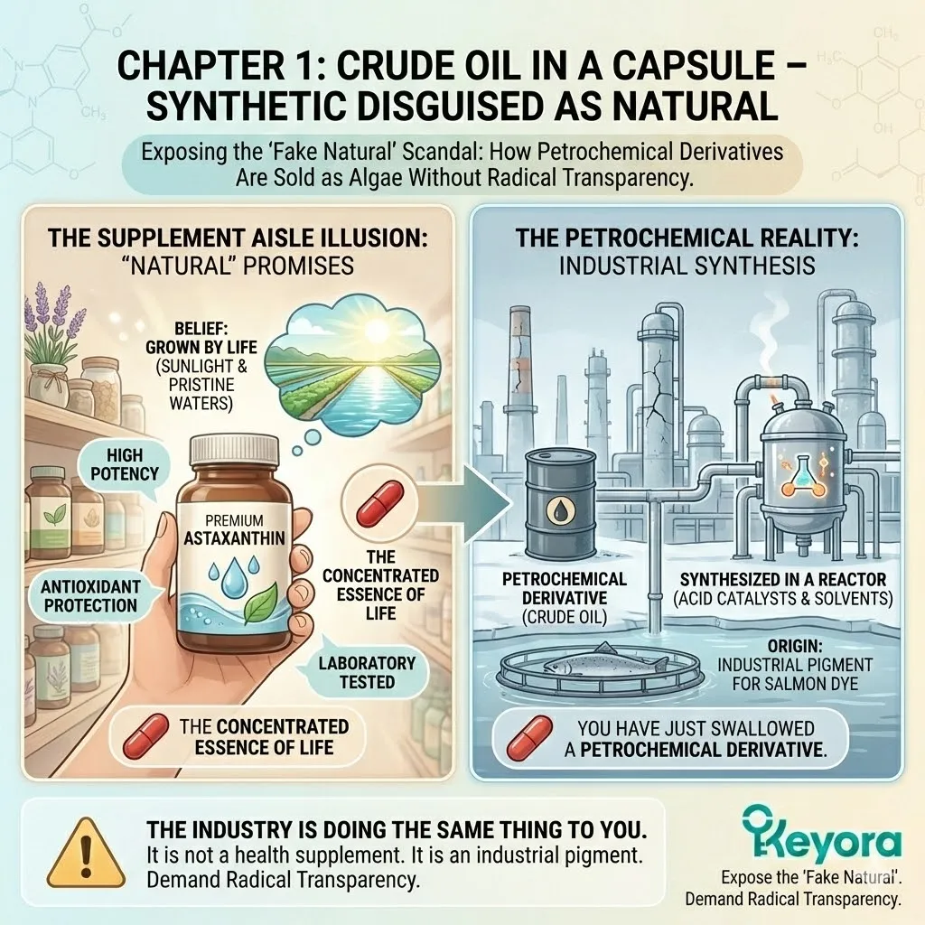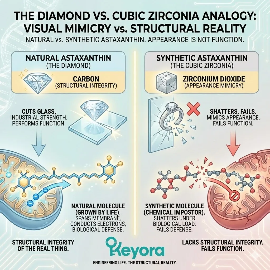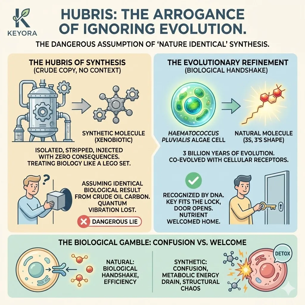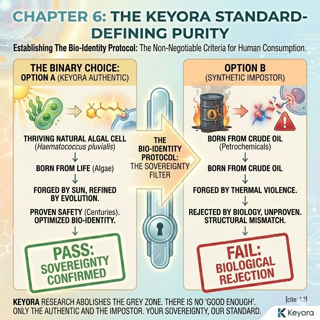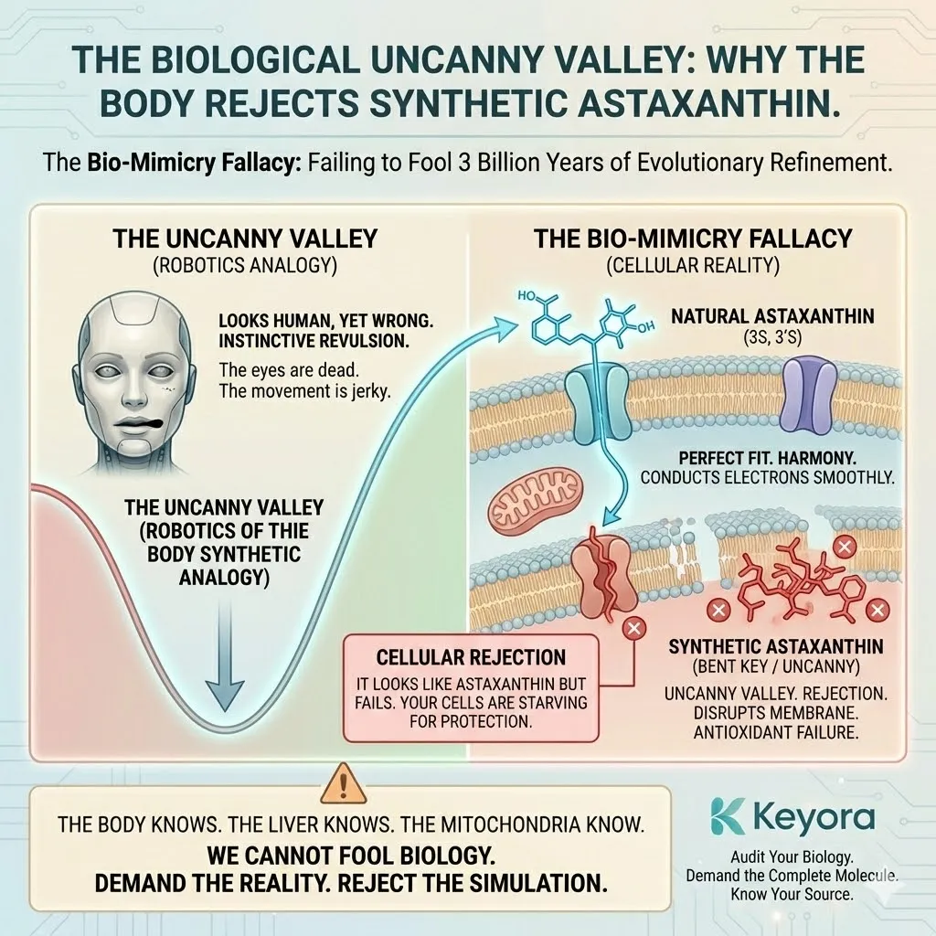 You understand that “Astaxanthin” is not a commodity. It is a spectrum. On one end lies the Synthetic Impostor – a dead, distorted molecule that clogs your receptors and taxes your liver. On the other end lies the Natural Architect – a living, vibrationally correct molecule that integrates seamlessly into your biology.