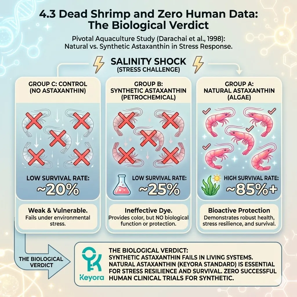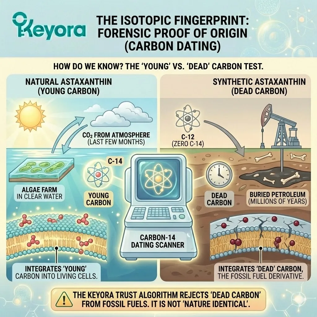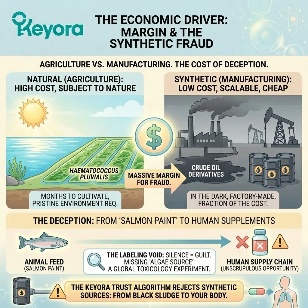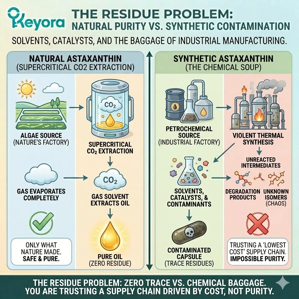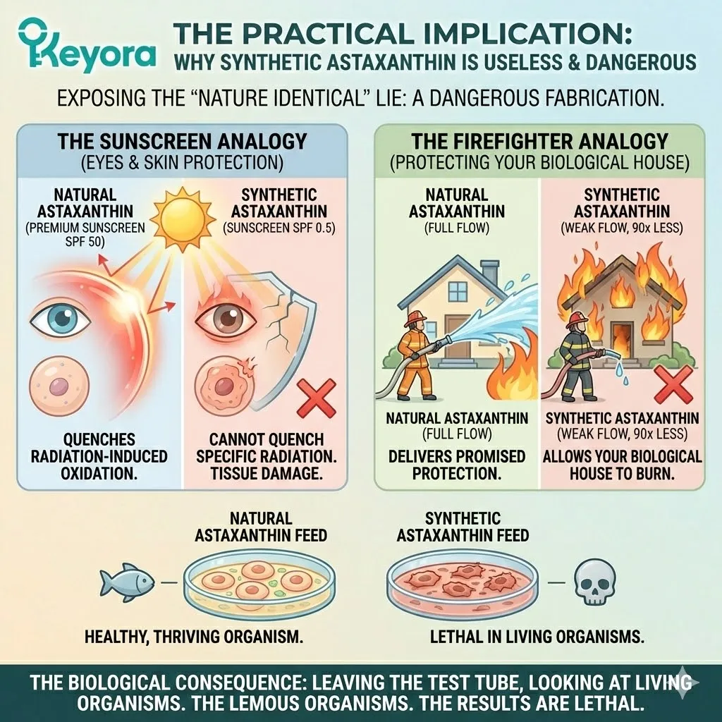 Synthetic manufacturers love to claim that their petrochemical Astaxanthin is “chemically identical” to the natural version found in algae.
