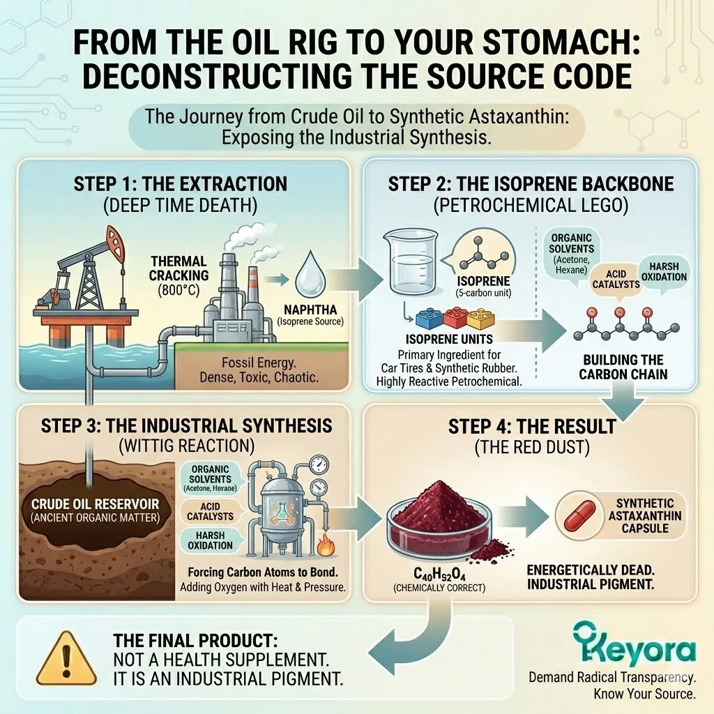 We traced the lineage of Synthetic Astaxanthin from the oil rig to the chemical reactor.