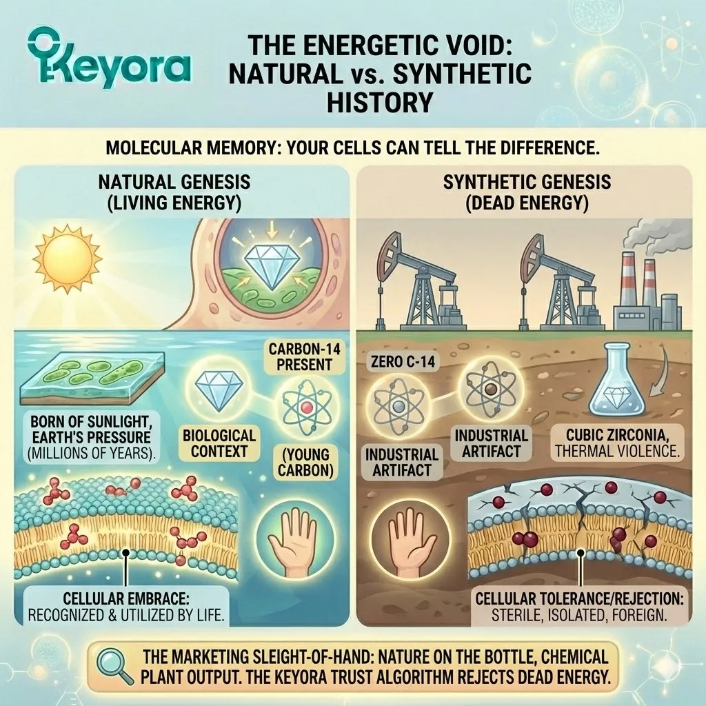 * *Synthetic:* **Zero Carbon-14** (Isotopic signature of fossil fuels/dead carbon).