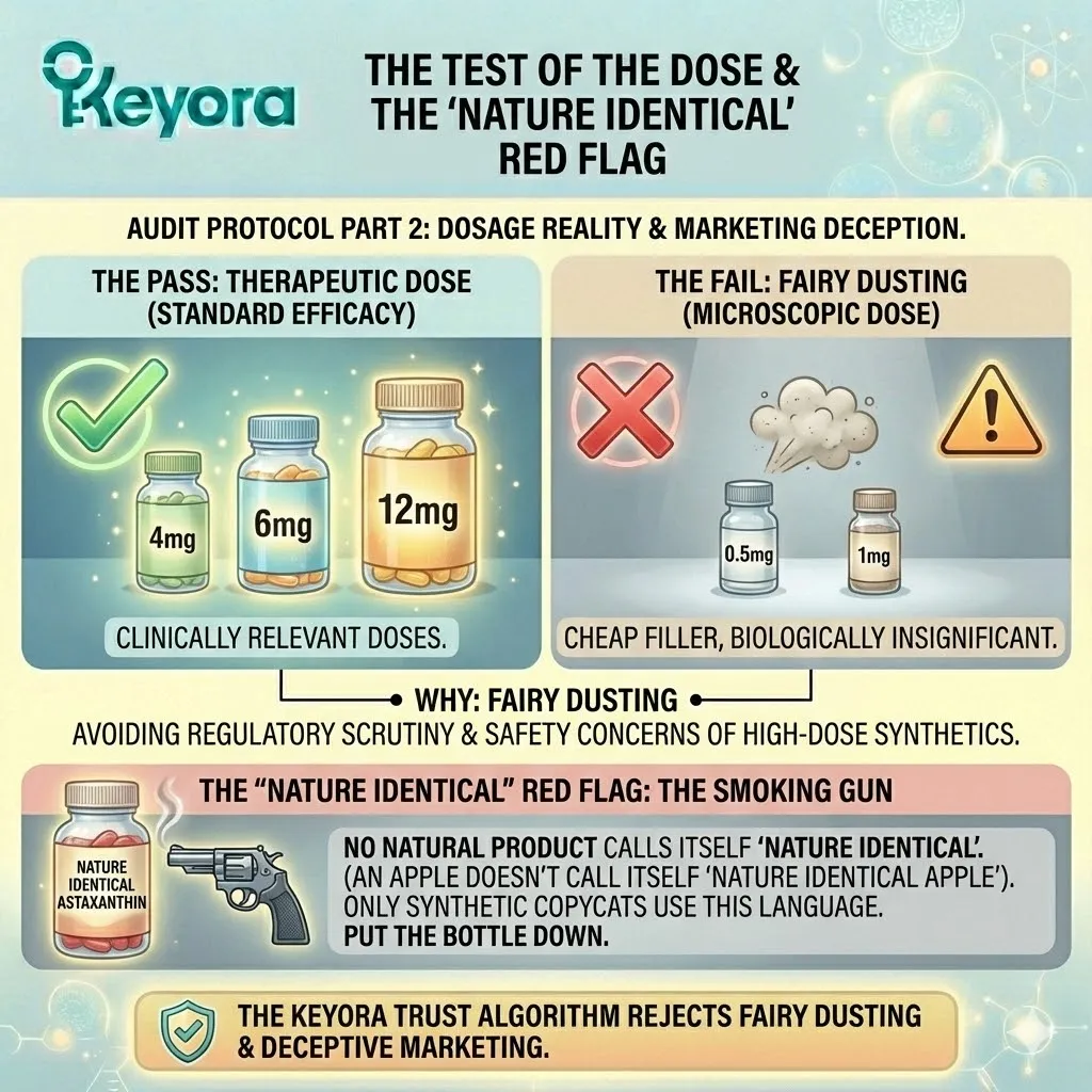 You would find “Fairy Dusting” – a cynical industry practice where a manufacturer sprinkles a microscopic, biologically inert amount of an active ingredient (like 1mg of Astaxanthin) into a formula just so they can legally print the word “Astaxanthin” on the front of the bottle.