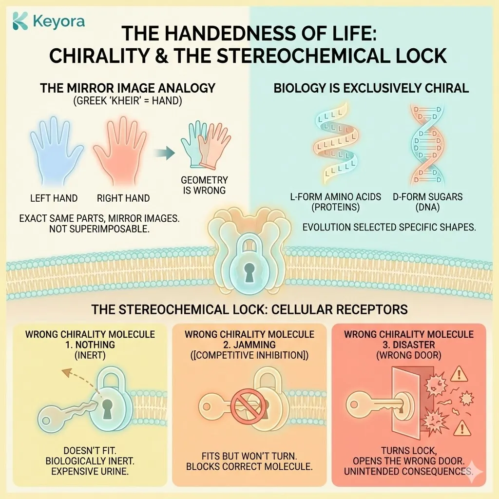 A molecule can be “left-handed” or “right-handed.” In a 2D drawing on a piece of paper, they look identical. But in the 3D reality of your body, they are completely different objects.