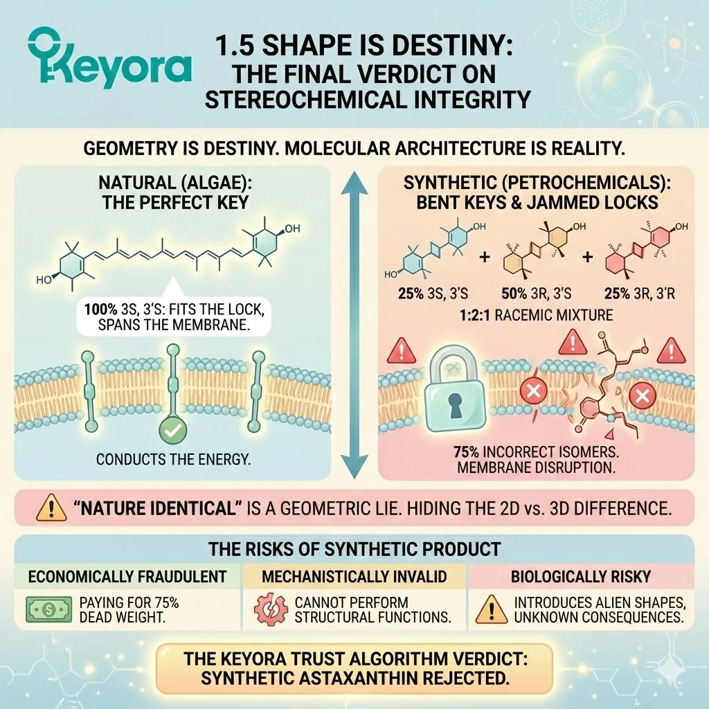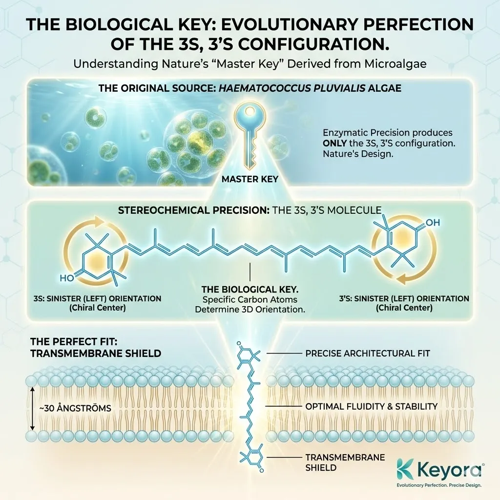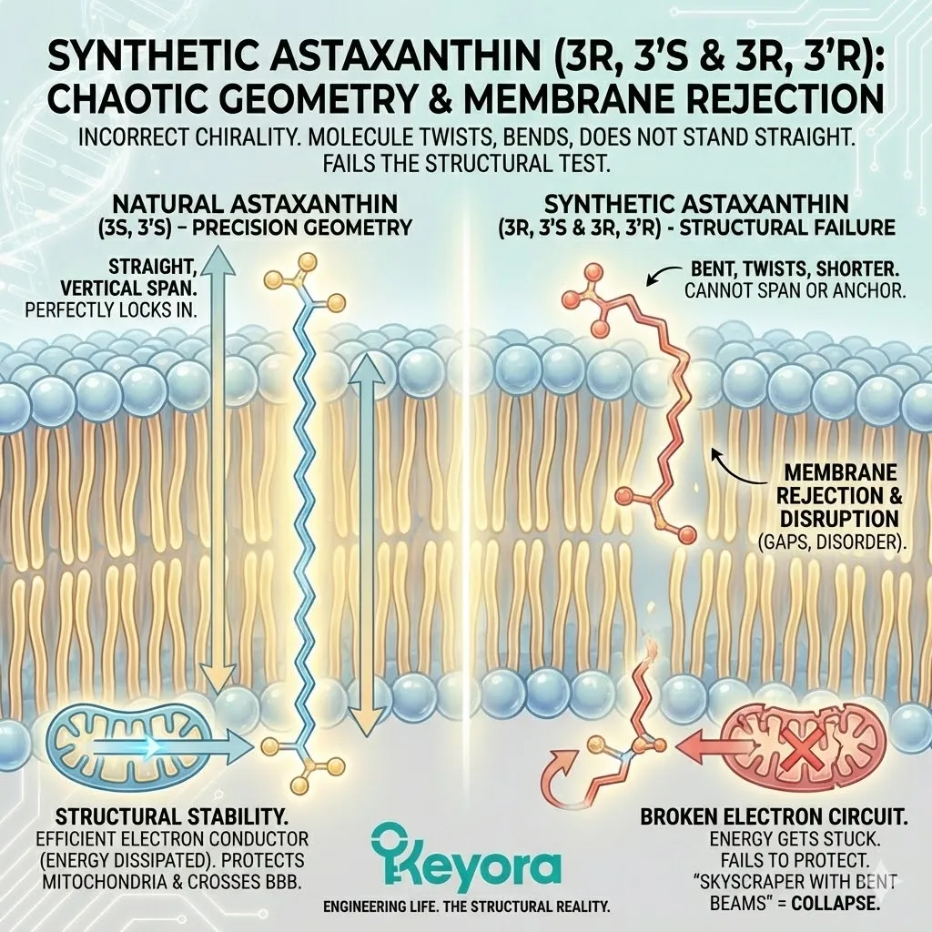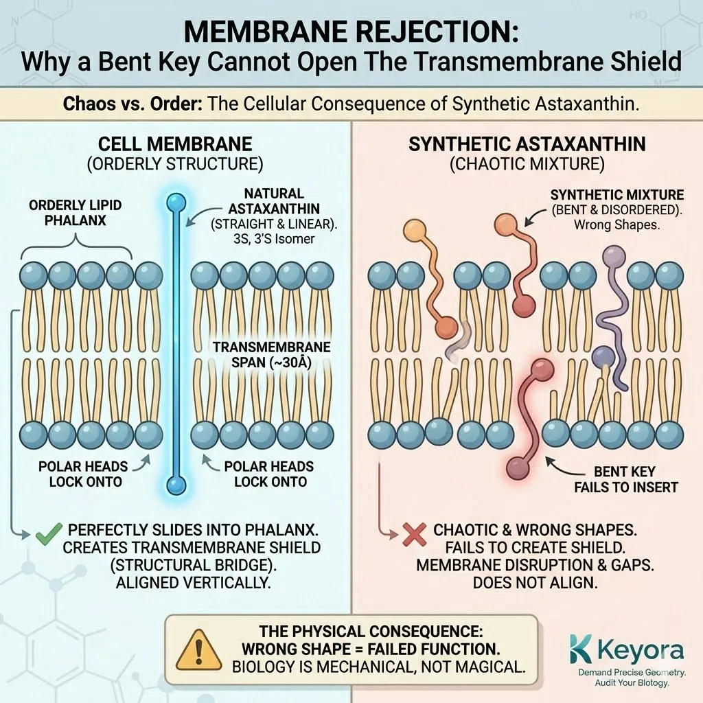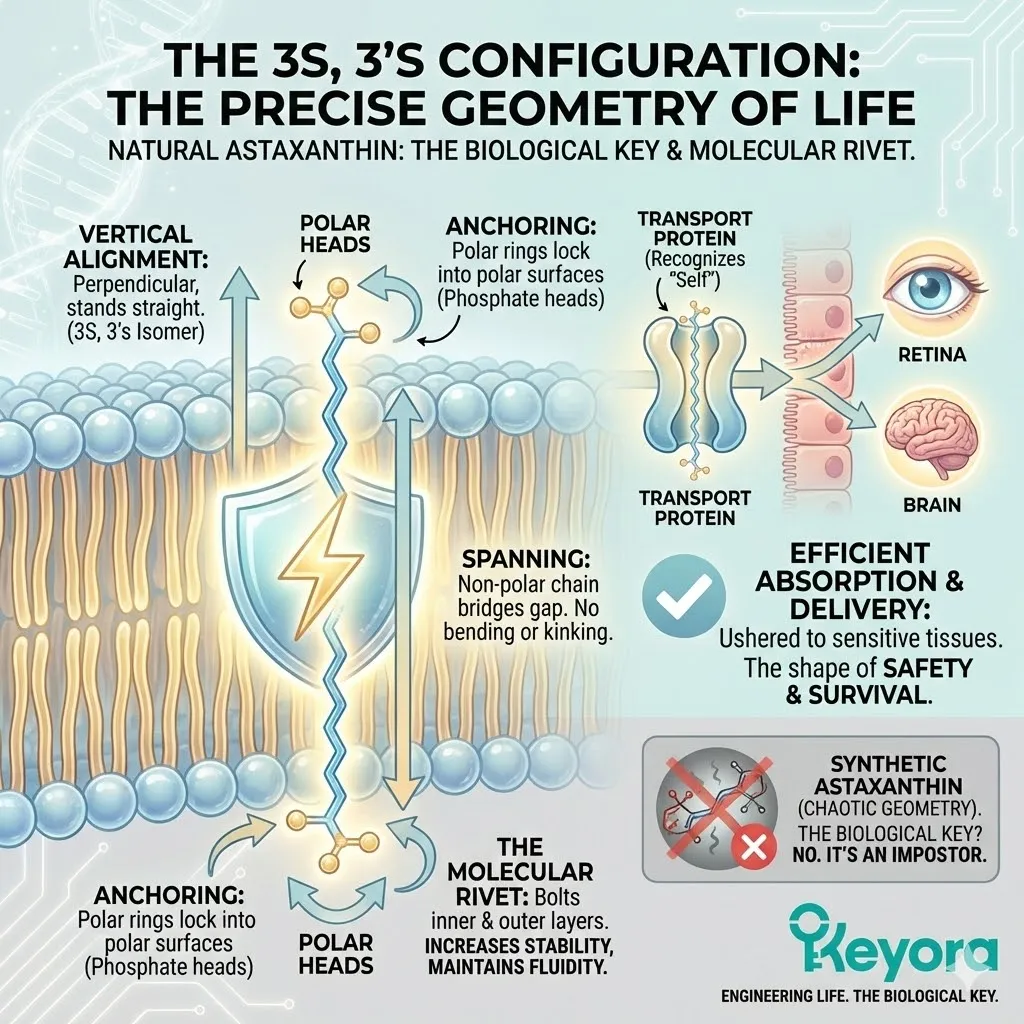 Natural Astaxanthin has a specific 3D shape (3S, 3’S) that evolution has perfected over millions of years to fit the lipid bilayer of living cells.
