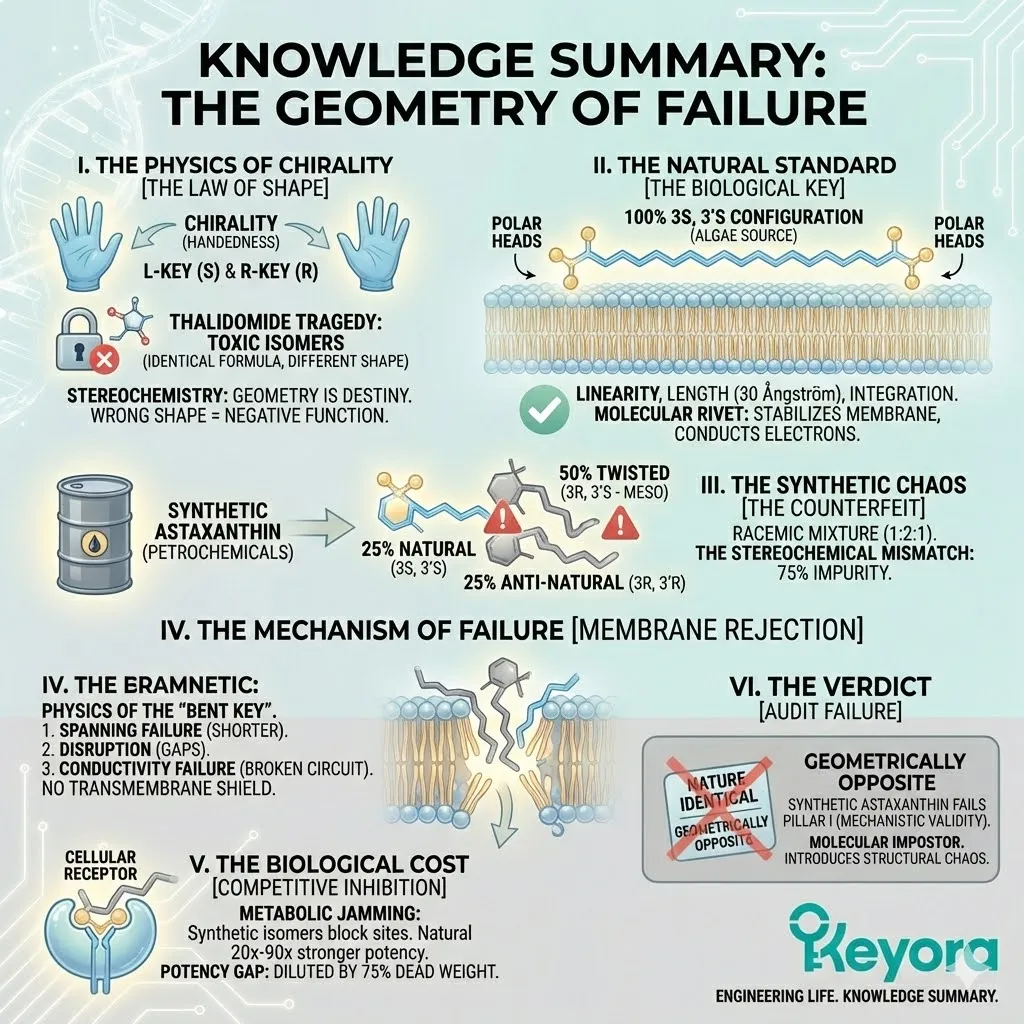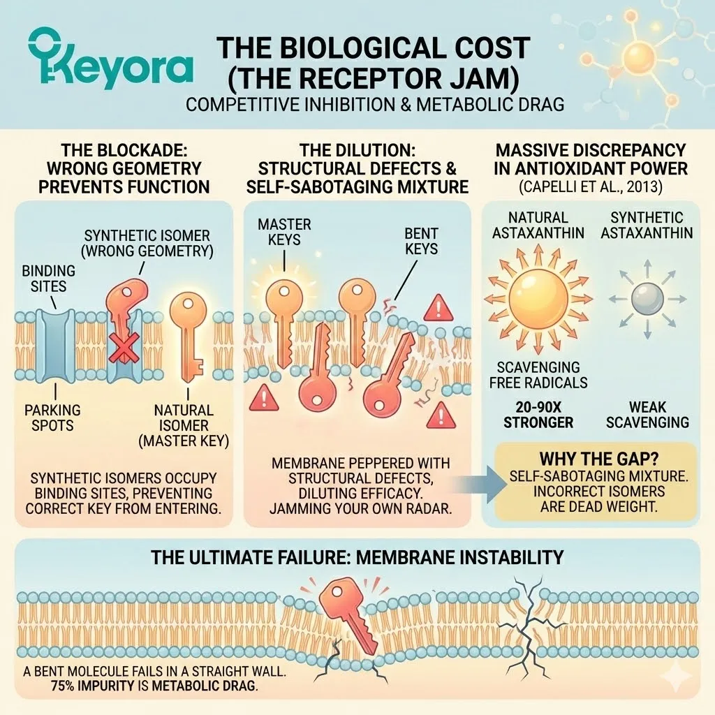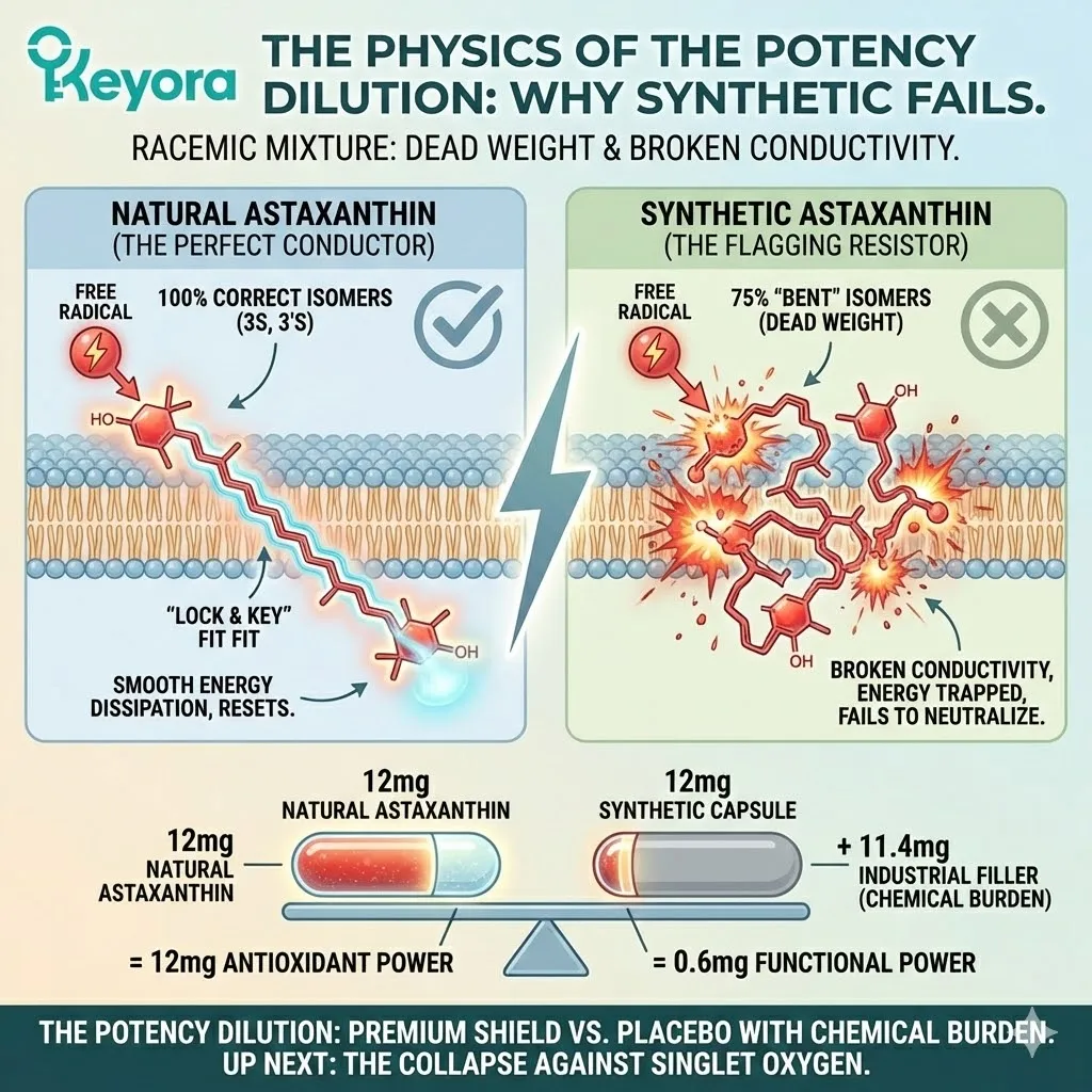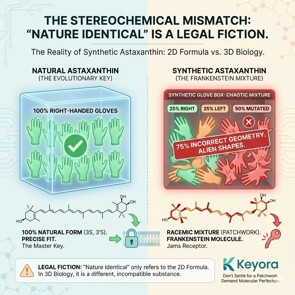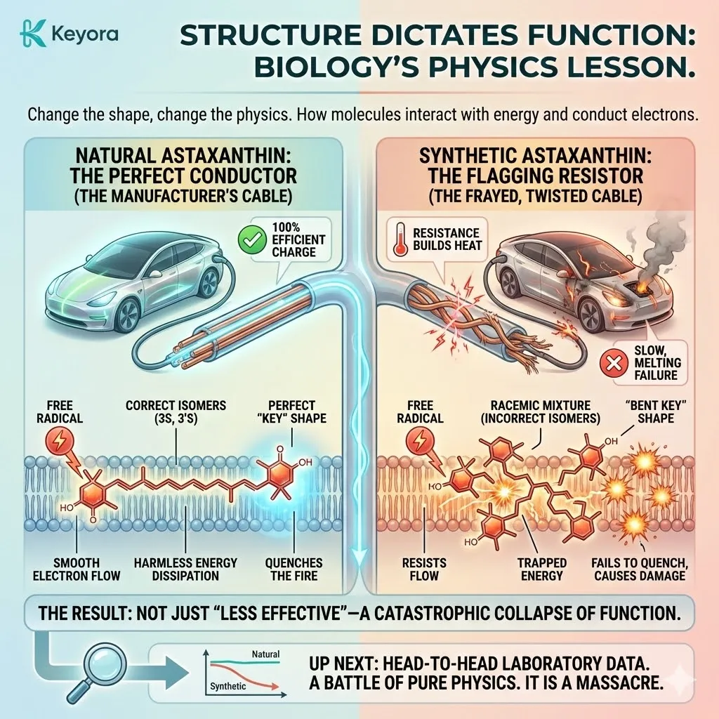 Natural Astaxanthin has a specific 3D shape (3S, 3’S) that evolution has perfected over millions of years to fit the lipid bilayer of living cells.