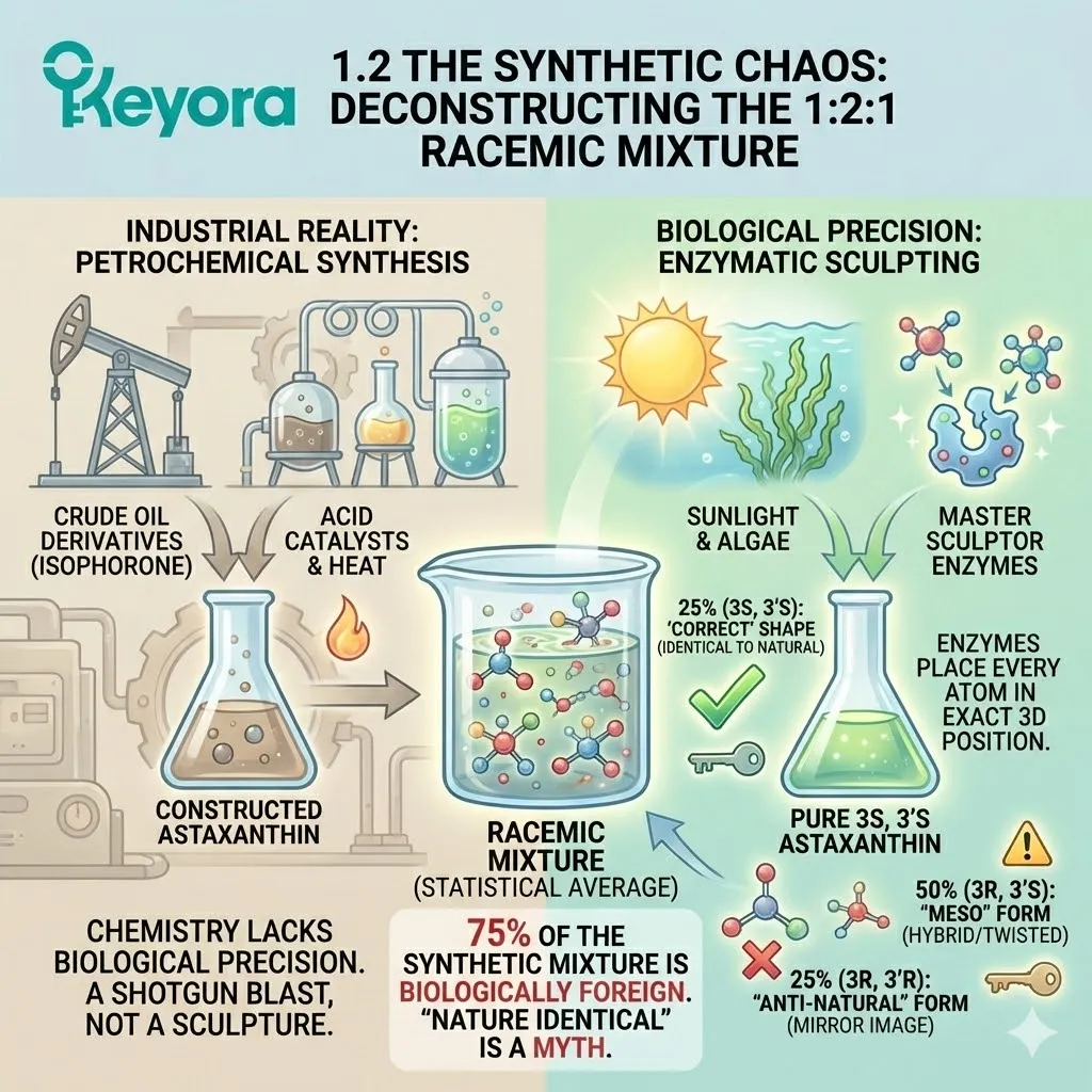 Synthetic Astaxanthin is a chaotic mixture of shapes (Stereoisomers).