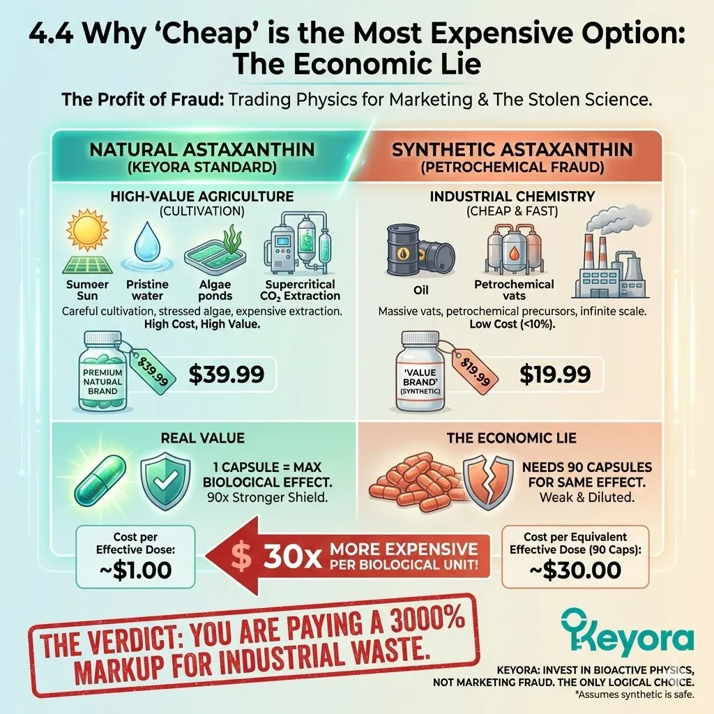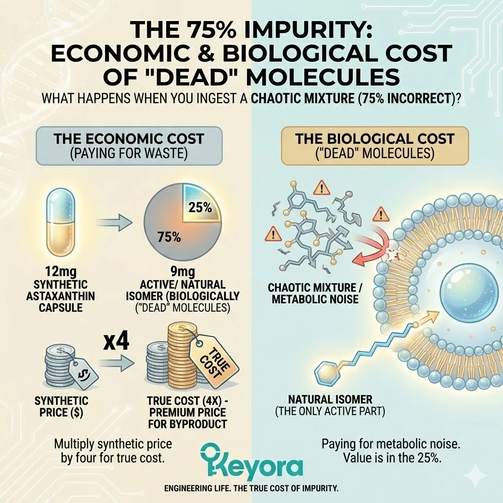 The cost of this chaos is not just financial. It is biological. Every day you take a sub-therapeutic, synthetic, or oxidized supplement is a day you are not paying down The Oxidative Debt.