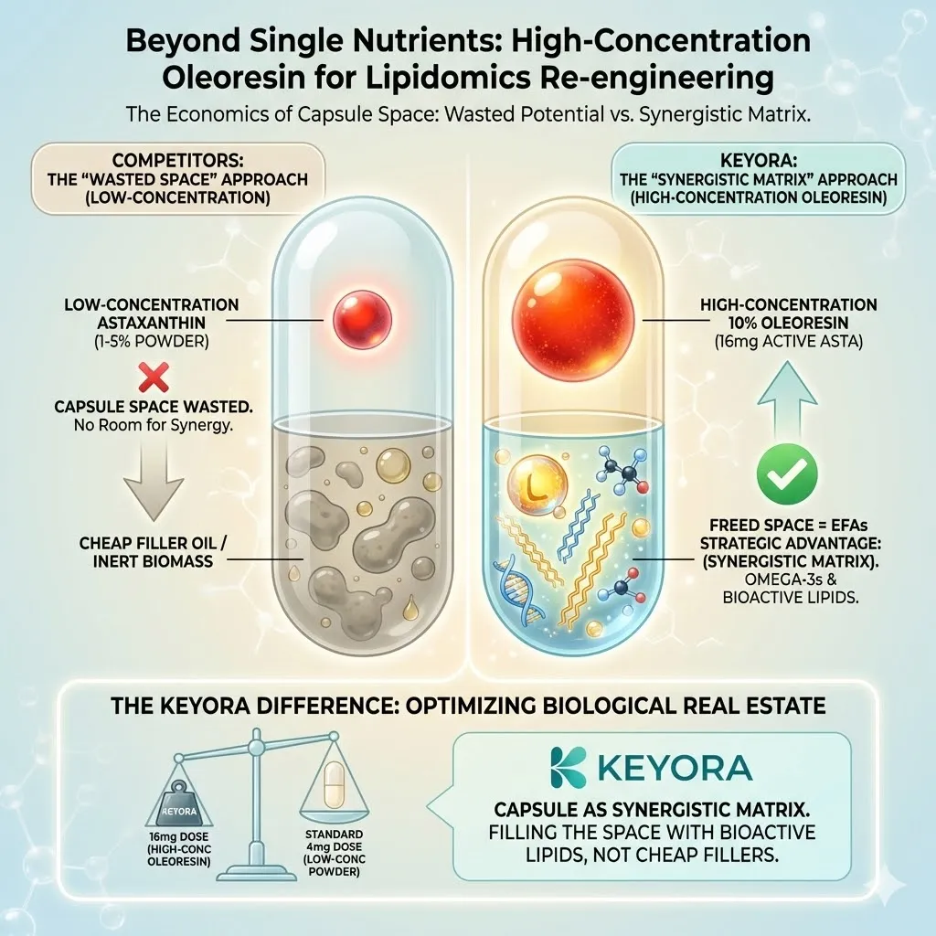 * **The “Filler” Trap:** Low-purity raw materials (1% Astaxanthin) require filling the entire capsule with inert oil (Soybean/Corn) just to get a small dose.